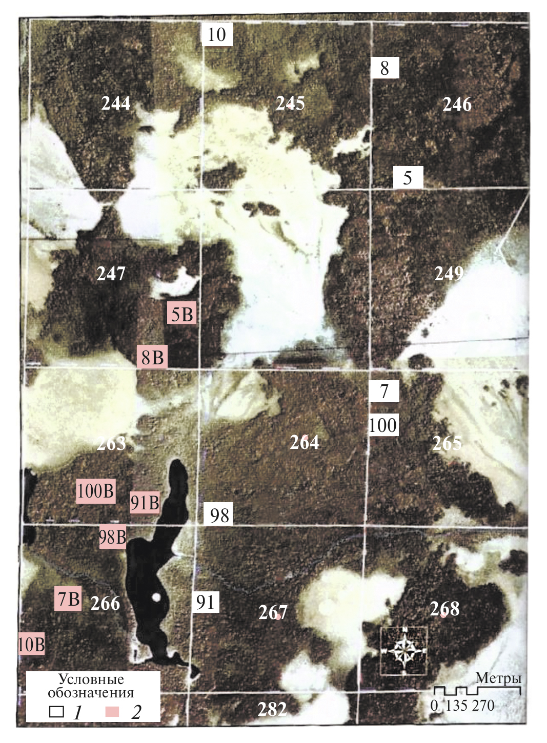 Пробные площади закладывали, руководствуясь отраслевым стандартом “Площади пробные лесоустроительные. Метод закладки” (ОСТ 56-69-83). Размер пробной площади определяли по наличию на ней не менее 200–250 деревьев основного элемента леса (с диаметром более 6 см) (Дыренков, 1984; Федорчук и др., 1998). Сплошной перечет древостоя с последующим вычислением всех таксационных показателей в коренных биогеоценозах (БГЦ) проводили регулярно каждые 5 лет, во вторичных лесных сообществах сплошной перечет древостоя впервые проведен в 2021 году.