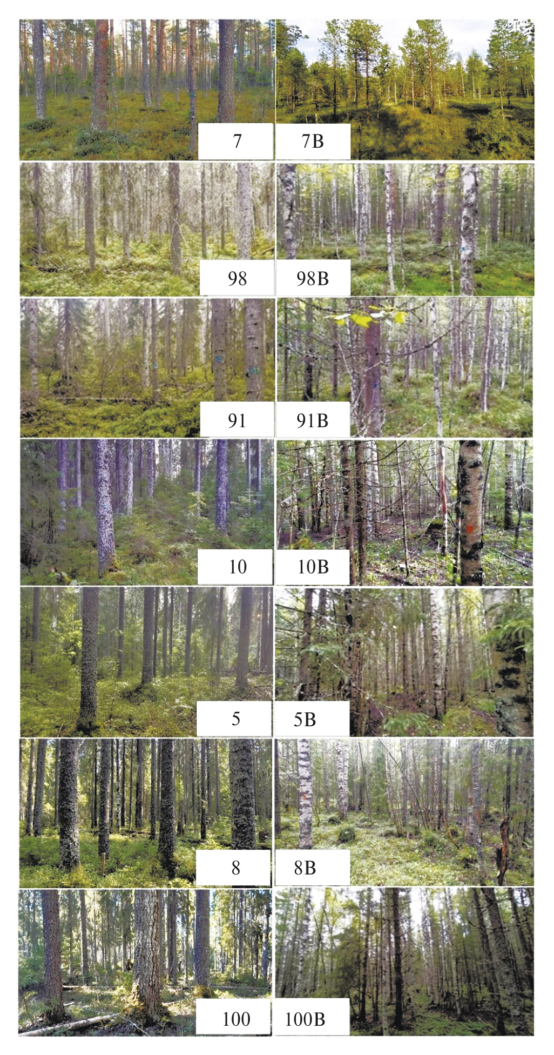 Рис. 2. Учетные объекты на территории резервата “Вепсский лес”. Слева — постоянные пробные площади в коренном лесу; справа — постоянные пробные площади, заложенные после вырубки коренного леса в 1973–1974 гг. Фото: Корепин А.А., Авезов А.А.