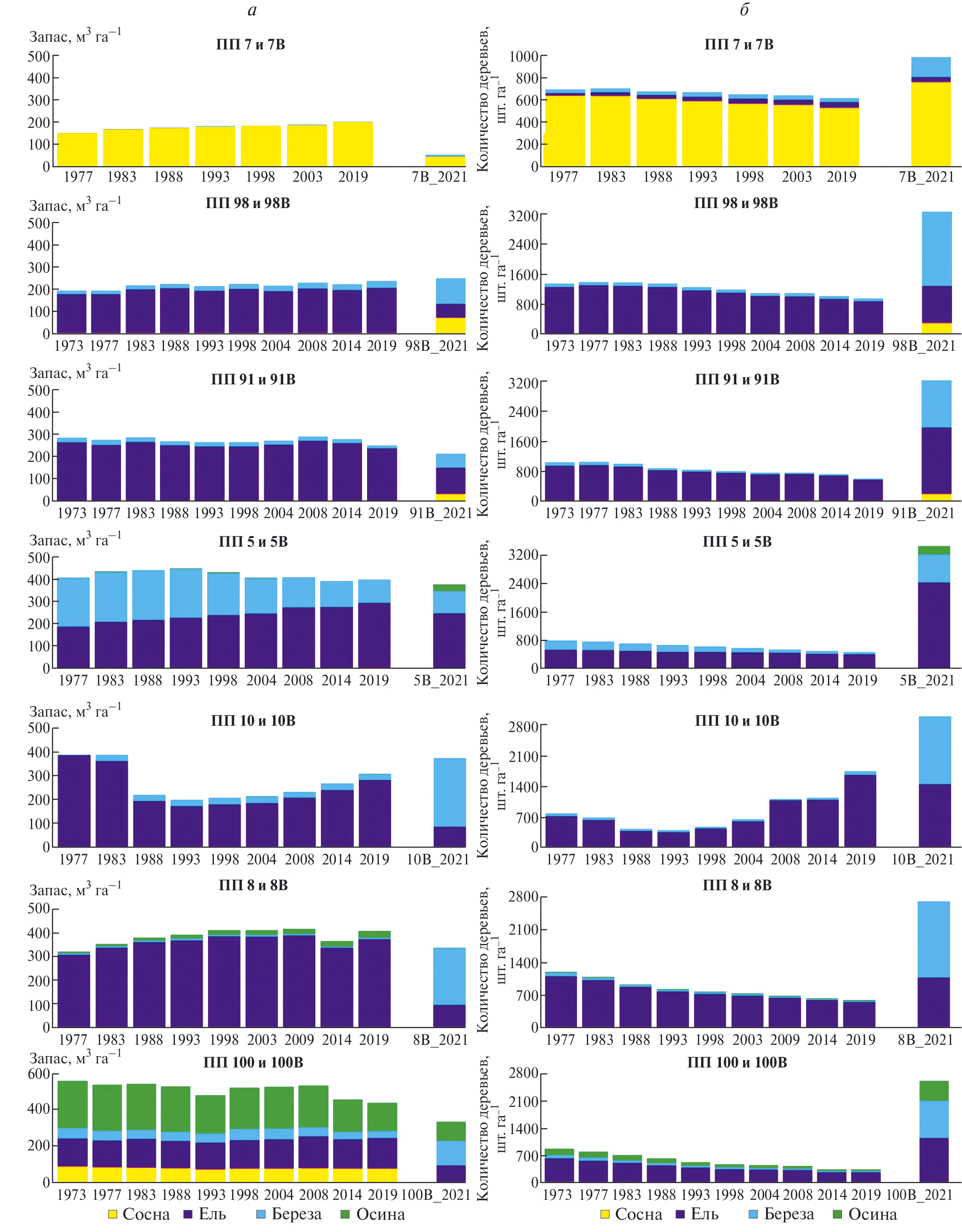 Динамика породного состава производных лесов. Доля хвойных пород в производных лесах в первые 15 лет после рубки редко превышала 20%, причем при рубке на многих участках удалось сохранить значительную часть елового подроста. Например, после проведения рубки численность сохраненного предварительного возобновления на ПП 5В составила 5.1 тыс. шт. га–1, на 7В — 0.4 тыс. шт. га–1 (сосна), на 8В — 0.7 тыс. шт. га–1, на 10В — 4.1 тыс. шт. га–1, на 91В — 2.1 тыс. шт. га–1, на 98В — 0.4 тыс. шт. га–1, на 100В — 2.3 тыс. шт. га–1 (Федорчук и др., 1998).