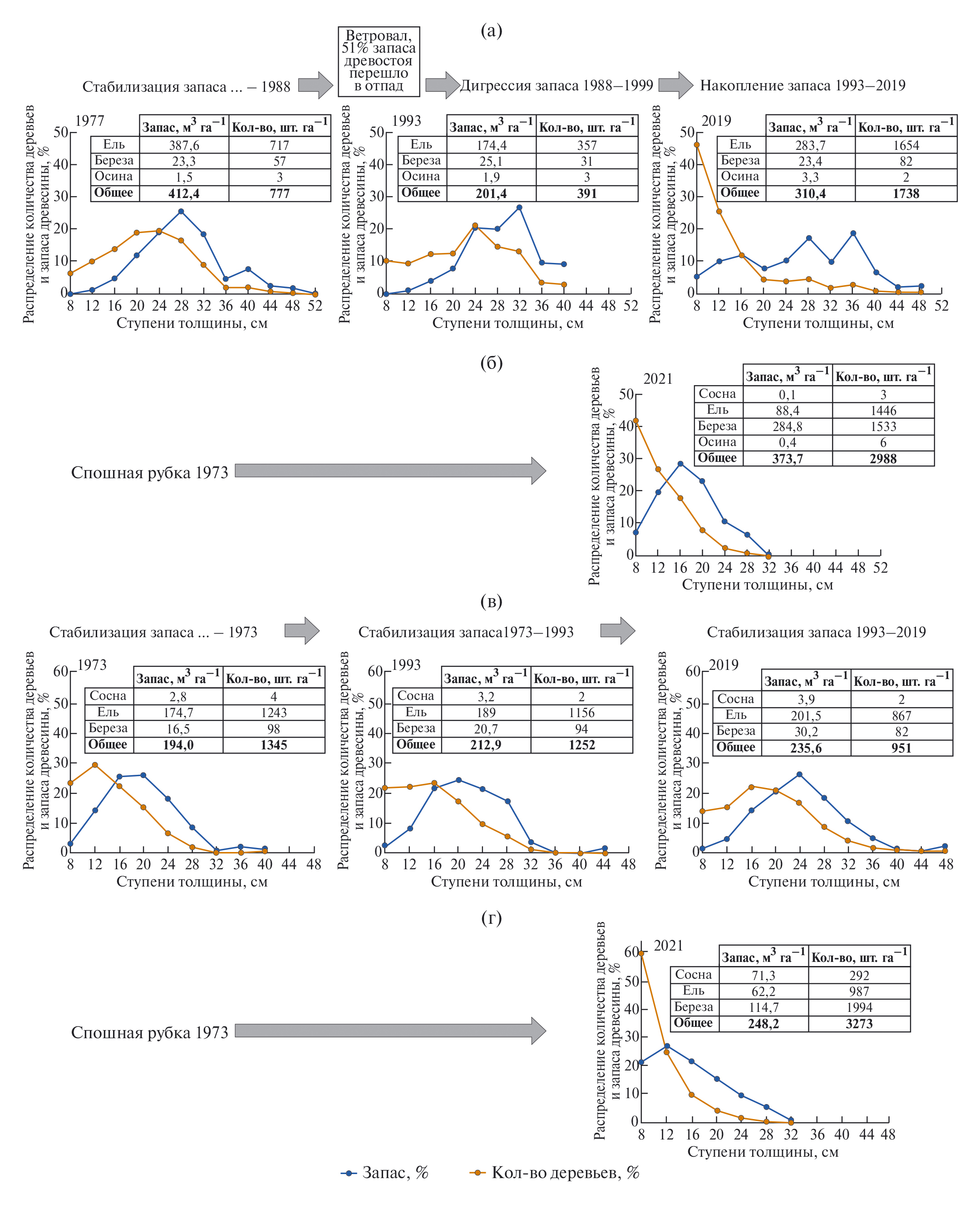 Рис. 4. Динамика запасов и количества деревьев по ступеням толщины на: а) ПП 10; б) ПП 10В; в) ПП 98; г) ПП 98В.