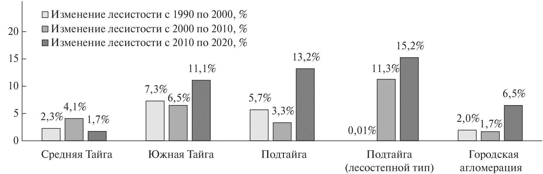 На рис. 3 видно, что наибольшим приростом лесных площадей отличаются ландшафты южнотаежной подзоны и подтаежной зоны, в которых лесистость с 50–60% за три десятилетия увеличивалась до 75–80%. Рекордное увеличение лесных площадей с 44.2 до 70.7% произошло в лесостепном ландшафте. Минимальным же приростом характеризовались среднетаежные ландшафты, их увеличение составило всего 5–10%.