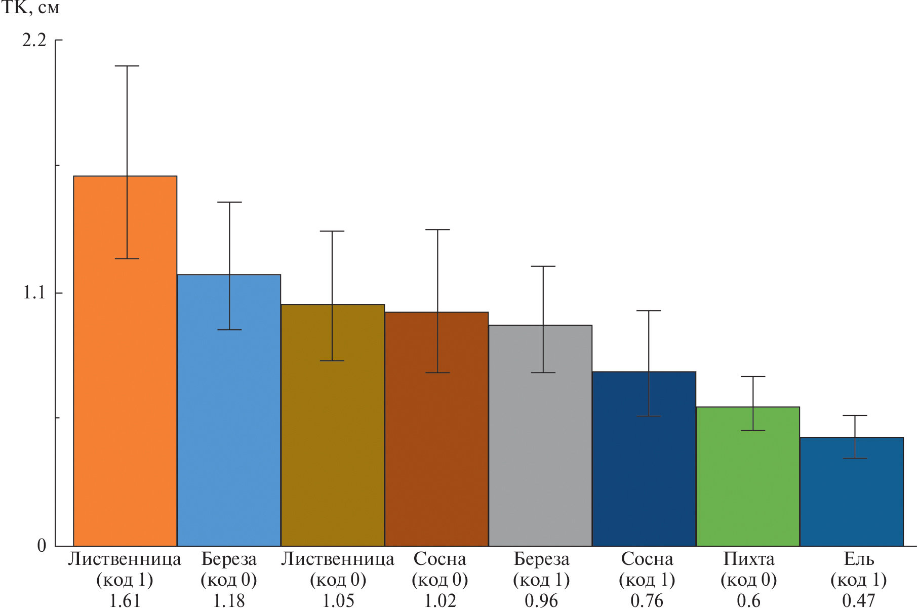 Все регрессионные коэффициенты в модели (1) значимы на уровнях вероятности в диапазоне от p < 0.98 до p < 0.999. Несмотря на существенно более низкие коэффициенты детерминации модели для ОТК по отношению к модели для ТК, каких-либо различий по уровню значимости регрессионных коэффициентов тех и других не выявлено. Более того, на обозначенных уровнях вероятности в моделях для ТК и ОТК оказались статистически значимыми одни и те же независимые переменные, и предположение о меньшей изменчивости ОТК по отношению к ТК не подтвердилось. Напротив, на статистически значимом уровне были подтверждены региональные различия как ТК, так и ОТК для сосны, березы и лиственницы, а также соответствующие различия между пихтой и елью.
