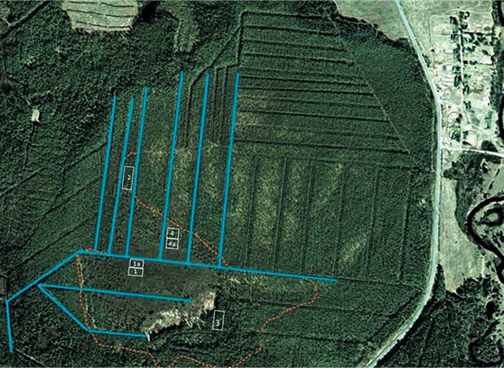 В августе 1999 года на юго-западном склоне болотного массива Сосвятское произошел низовой торфяной пожар на площади 29 га, где опытная осушительная сеть, проложенная в 1972 г., имела различные расстояния между осушительными каналами (60—160 м) при глубине их ко времени пожара 1 м (рис. 1). Данные предыдущего исследования (Вомперский и др., 2007) показывают, что огонь продвигался внутри межканавья 160 м (пробная площадь 1, далее ПП 1) в обоих направлениях, но больше на восток. Позже низовой пожар перебросился через канаву, в соседнее с юга межканавье. Распространение огня на запад было приостановлено магистральным каналом, продвижение пожара на север продолжалось внутри межканавья 60 м (ПП 2). Пожар был локализован за 12 часов, но тление длилось еще сутки.
