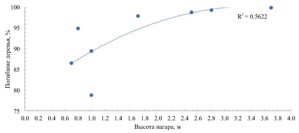Прослеживается зависимость погибших деревьев от высоты нагара на стволах (рис. 2). Чем выше нагар на стволах, тем больший процент погибших деревьев на ПП. При высоте нагара 2.8 и 3.7 соответственно на ПП 1 и ПП 4 процент погибших деревьев составил 100 % (табл. 2).