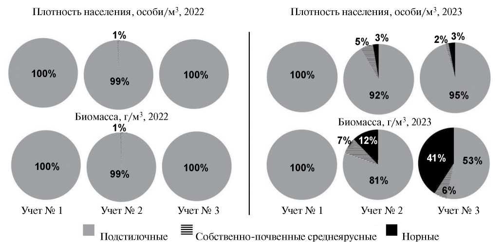 Рис. 1. Различия структуры комплексов дождевых червей в валежнике сосны обыкновенной в период благоприятного (2022, слева) и засушливого (2023, справа) летних сезонов.