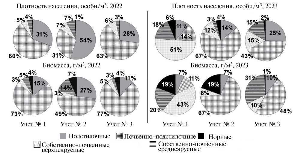 В течение благоприятного летнего сезона (2022), для которого характерно периодическое увлажнение валежника осадками (Архив погоды… 2024), что способствовало его защите от чрезмерного перегревания и высыхания, структура комплексов дождевых червей сохраняла некую стабильность.