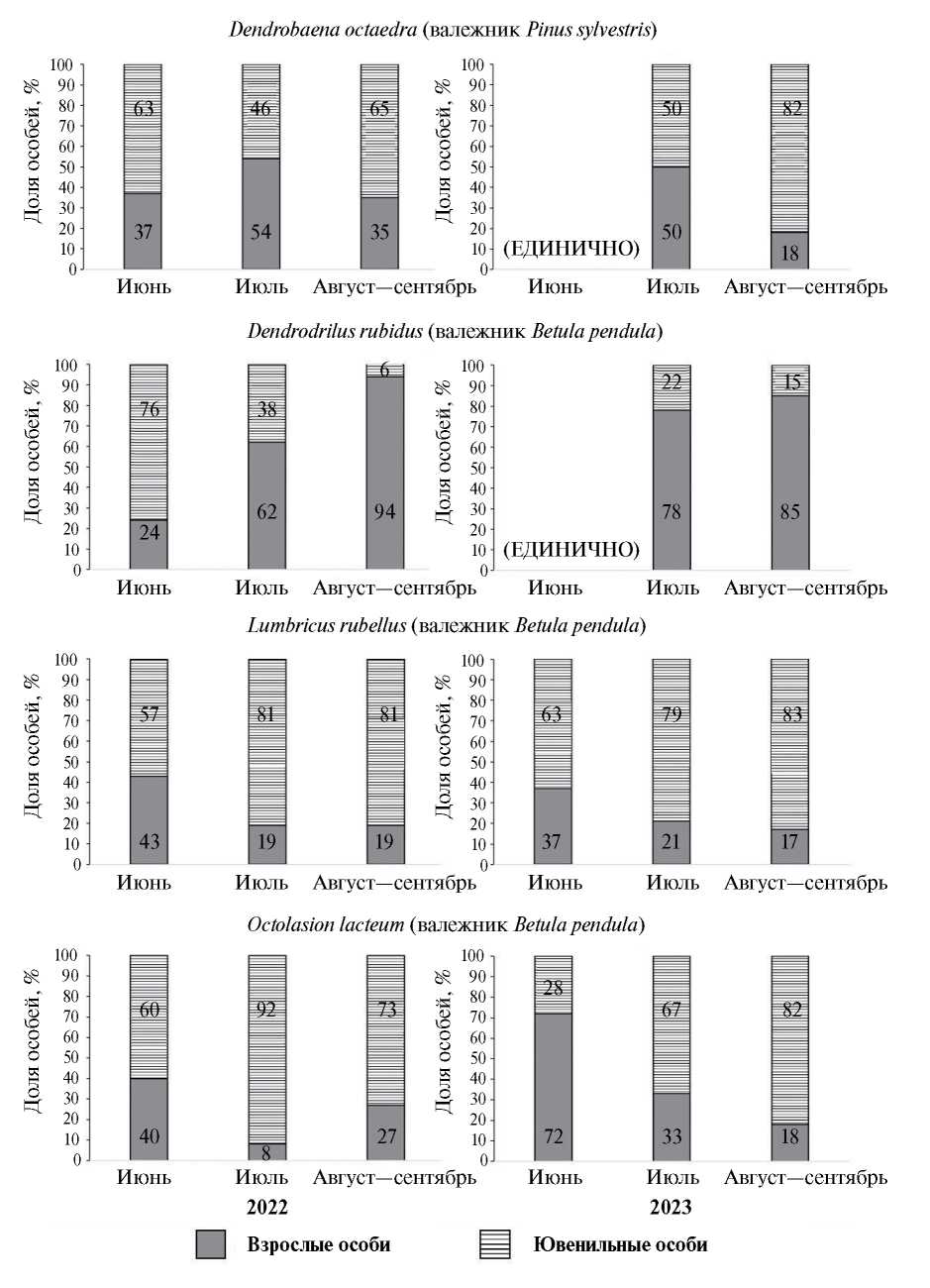Следует отметить, что в течение летнего сезона в валежниках каждого исследованного типа леса доля ювенильных особей дождевых червей преобладающих видов и экологических групп (D. octaedra в сосняке, D. rubidus, L. rubellus, O. lacteum в березово-осиновом лесу) либо находилась в равном соотношении с долей взрослых (кроме D. rubidus), либо превышала таковую (рис. 3), что свидетельствует о благоприятном состоянии популяции, так как в ней с высокой вероятностью происходит смена поколений (Kooch, Haghverdi, 2014; Гераськина, Шевченко, 2018).
