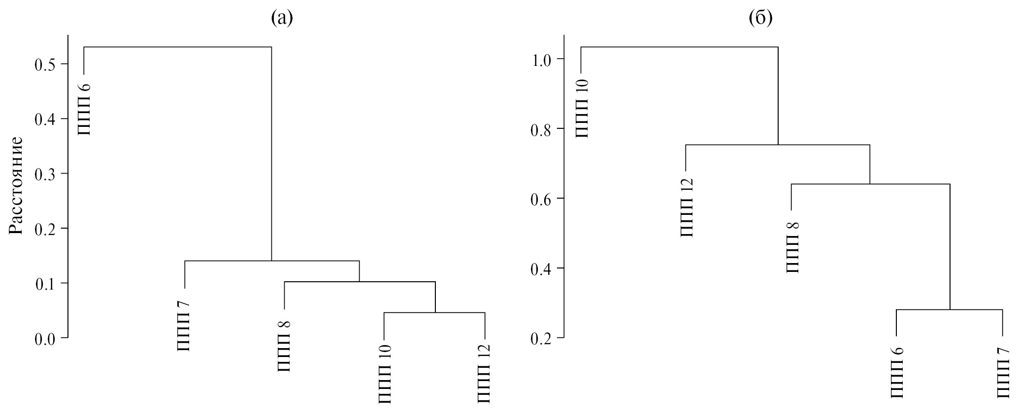 Рис. 1. Диаграмма кластеризации рядов распределения деревьев по диаметру ствола (а) и подроста по высоте (б) на ППП.