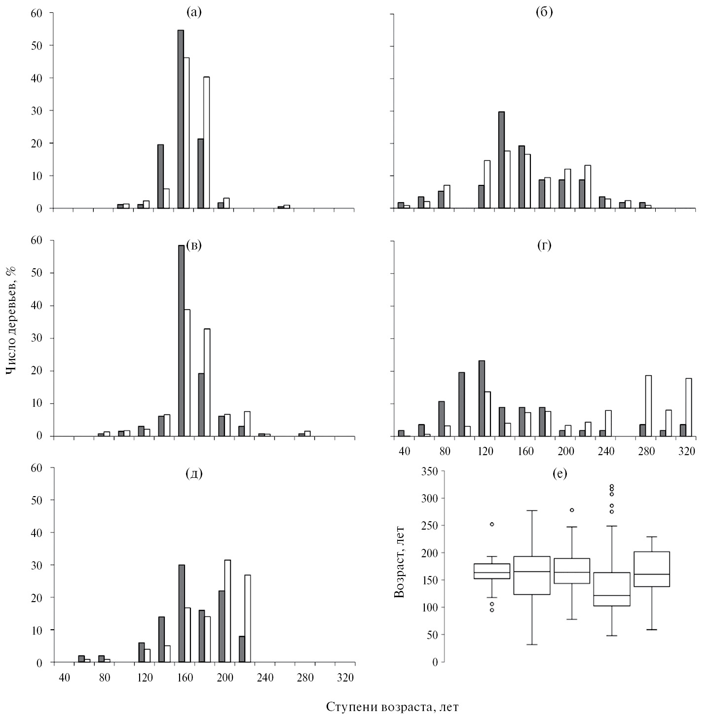 Рис. 2. Распределение числа стволов (темные столбцы) и запаса древесины (светлые столбцы) по 20-летним ступеням возраста в притундровых ельниках: а – травяно-зеленомошном (ППП 6); б – сфагновом (ППП 7); в – морошково-сфагновом (ППП 8); г – зеленомошном (ППП 10); д – кустарничково-зеленомошном (ППП 12). На диаграмме (е) представлена статистика рядов распределения деревьев по возрасту на ППП в порядке возрастания их нумерации.
