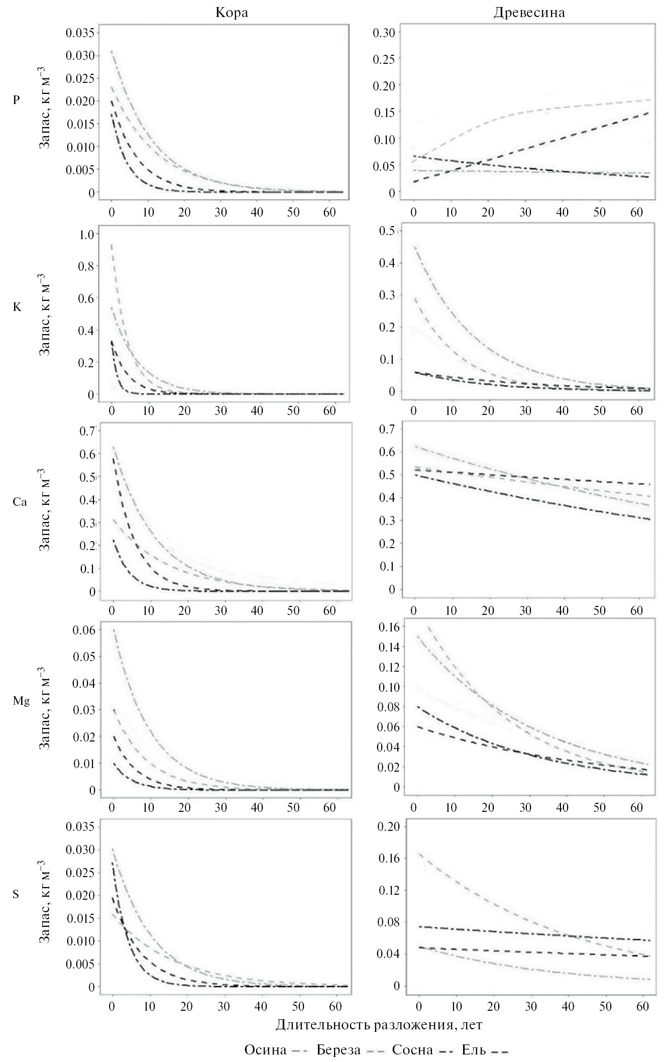 Динамика запасов рассматриваемых макроэлементов в древесине была более разнообразной по сравнению с таковой, наблюдаемой в коре валежа. Накопление Р имело видоспецифичный характер: в стволах березы и ели запасы этого элемента возрастали, в то время как у осины и сосны они оставались без значимых изменений. Мы предполагаем, что видоспецифичность накопления Р обусловлена различным составом ксилофильных организмов, использующих в качестве субстрата и среды обитания валеж определенных древесных пород, степени разложения и, как следствие, элементного состава (Fillipiak et al., 2016). Запасы других макроэлементов либо значимо не изменялись, либо уменьшались с различной скоростью, причем у лиственных пород интенсивность потери была выше по сравнению с таковой у хвойных.