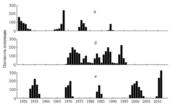 Рис. 1. Динамика численности некоторых насекомых-филлофагов, размножавшихся в массе в Теллермановской дубраве за последние 70 лет: а – непарный шелкопряд, число кладок яиц на 50 дер.; б – зеленая дубовая листовертка, число кладок яиц на 5 пог. м ветвей; в – зимняя пяденица, число бабочек-самок на 1 дер. (По: Рубцов, Уткина, 2019).