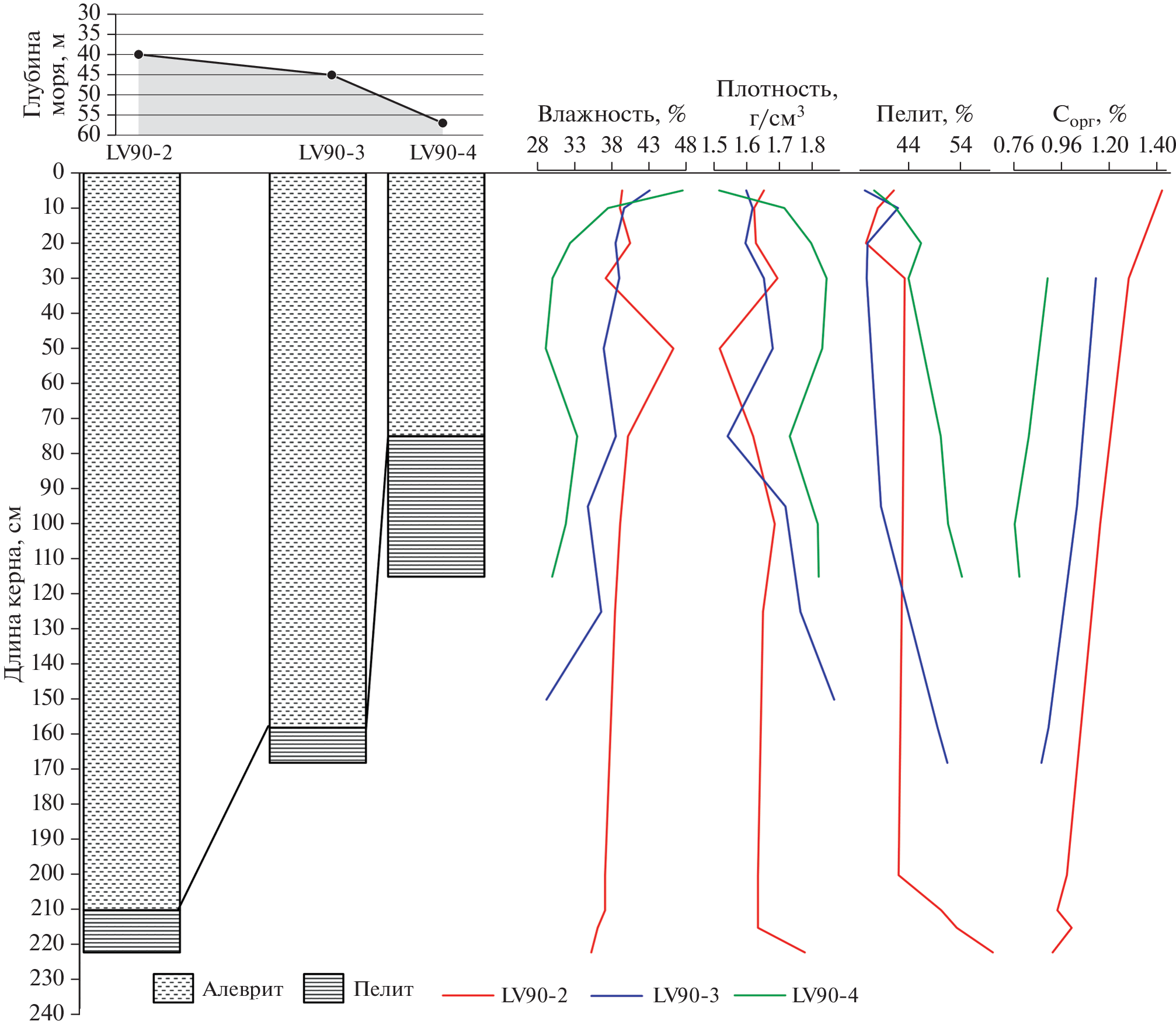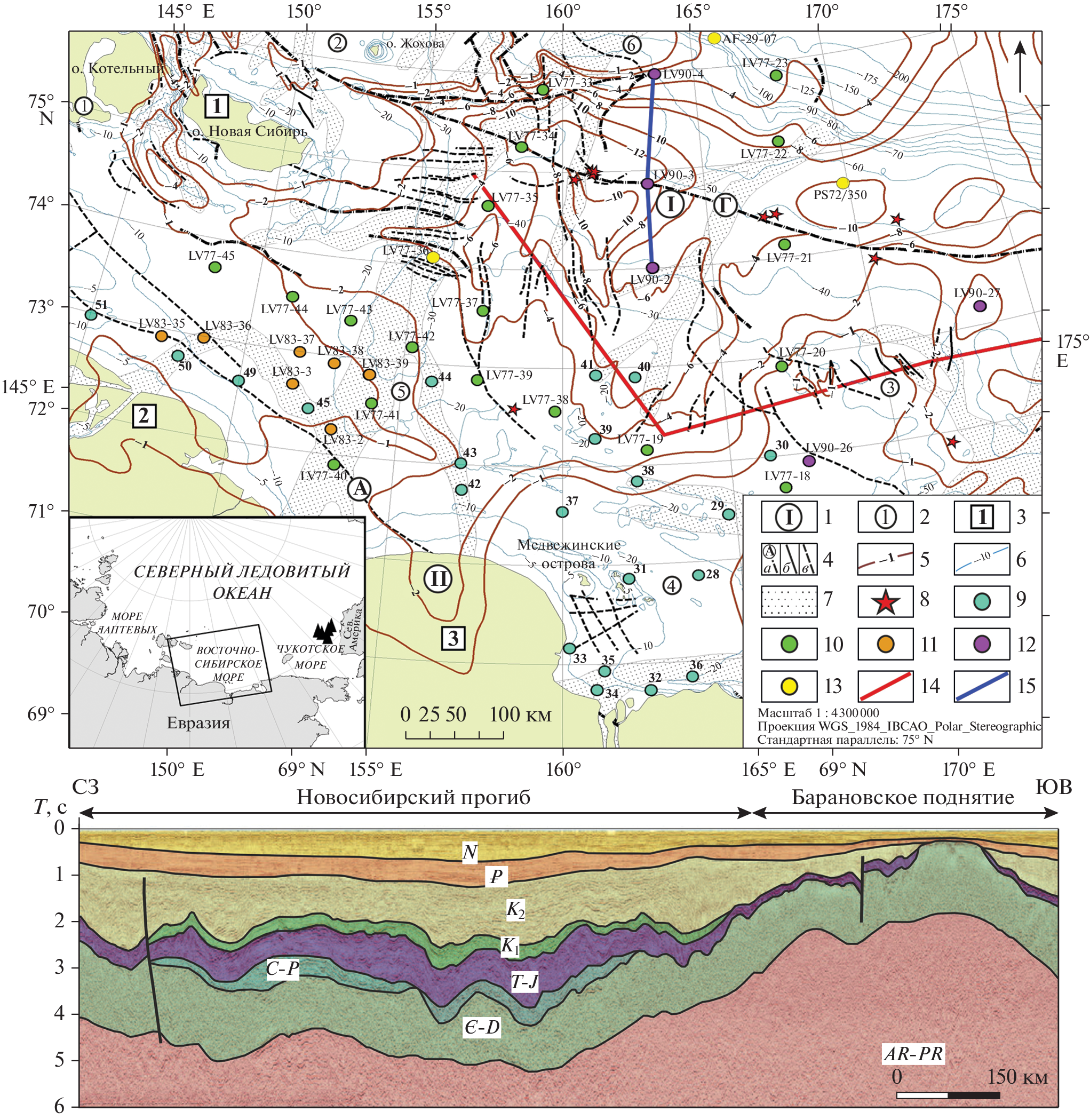 On the basis of lithological and gas geochemical studies and a comprehensive interpretation of the available materials, the main factors of the formation and distribution of grain size distribution, water-physical properties, organic saturation, concentrations and geochemical parameters of hydrocarbon gases in seafloor sediments of geostructures of the western part of the East Siberian Sea are summarized and analyzed. It has been established that the sediments of the northern and central parts of the study area are represented by aleurite-pelites, the southern ‒ by aleurite-pelite-psamites with variations in Corg values ‒ 0.6–2.0%, natural humidity and density ‒ 18–43% and 1.5–2.0 g/cm3, open porosity ‒ 17–33%, the concentrations of methane and its homologues are 0.001–5.934 and 0.00003–0.0312 cm3/kg, the molecular mass of the hydrocarbons fraction, the “wetness”, “dryness” coefficients, and the coefficients of the transformation are 16.05–22.6 g/mol, 0.2–51%, 1–1999, 0.2–50.8 and δ13С‒СН4 (–82.7…–38.4‰). Based on the values of gas geochemical parameters, eleven types of gas sources were identified in bottom sediments. In the process of research, it was found that the formation of hydrocarbon anomalies in sediments is mainly associated with their reservoir properties, Corg content and depths of their sampling, as well as with the complex influence of geological factors, the main of which are the gas saturation of the underlying sediments and the type of gas sources, discontinuous and plicative tectonics, geostructures position, thickness of Quaternary deposits, coal and gas content and age of the folded base. To a lesser extent, anomalies of hydrocarbon gases are associated with the lithological composition and density parameters of sediments.