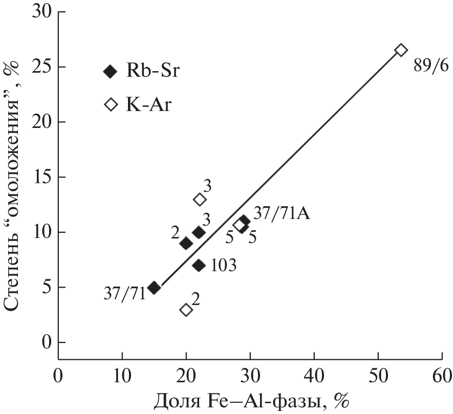 The mineralogical, structural and crystal-chemical features of seven samples of globular phyllosilicates of the glauconite-illite series (GPS) from the Lower Cambrian of Northern Estonia and Western Lithuania, from the Middle Cambrian of Western Latvia, and also from the Lower Ordovician of Northern Estonia and Western Latvia are considered for the first time. The Al index GPS (КAl = VIAl/ [VIFe3+ + VIAl]) varies from 0.27 to 0.59, which allows us to attribute them to the glauconite-illite series, in which GPS are represented mainly by glauconites (the Al index is КAl = 0.27–0.46) and one sample of Al-glauconite (КAl = 0.59). The content of K2O in minerals is from 7.12 to 7.90%. For the first time, the content of expandable layers (4–13%), their types (smectite, vermiculite) and the character of their alternation (R = 0, R = 2) were determined in the studied samples by simulation of experimental X-ray diffraction patterns from oriented preparations. Simulation of X-ray diffraction patterns obtained from nonoriented preparations made it possible to reveal the degree of three-dimensional order, and mean values of the unit-cell parameter b (9.056–9.094 Å) as well as the features of the distribution of their individual micaceous varieties and to establish the heterogeneity of the samples. Based on these data, the microheterogeneity of the Cambrian and Ordovician GSSs was established and compared with the heterogeneity in the previously studied Riphean GPS [Drits et al., 2013]. The obtained Rb-Sr и K-Ar ages for the Middle Cambrian and Lower Ordovician samples, as well as the earlier published dates for the Lower Cambrian samples, are “rejuvenated” compared to age limits accepted for the Cambrian and Lower Ordovician [Gradstein et al., 2020]. The dependence of the Cambrian and Lower Ordovician “rejuvenated” isotopic dates and the discovered GPS heterogeneity, as well as possible reasons for its occurrence, are discussed.