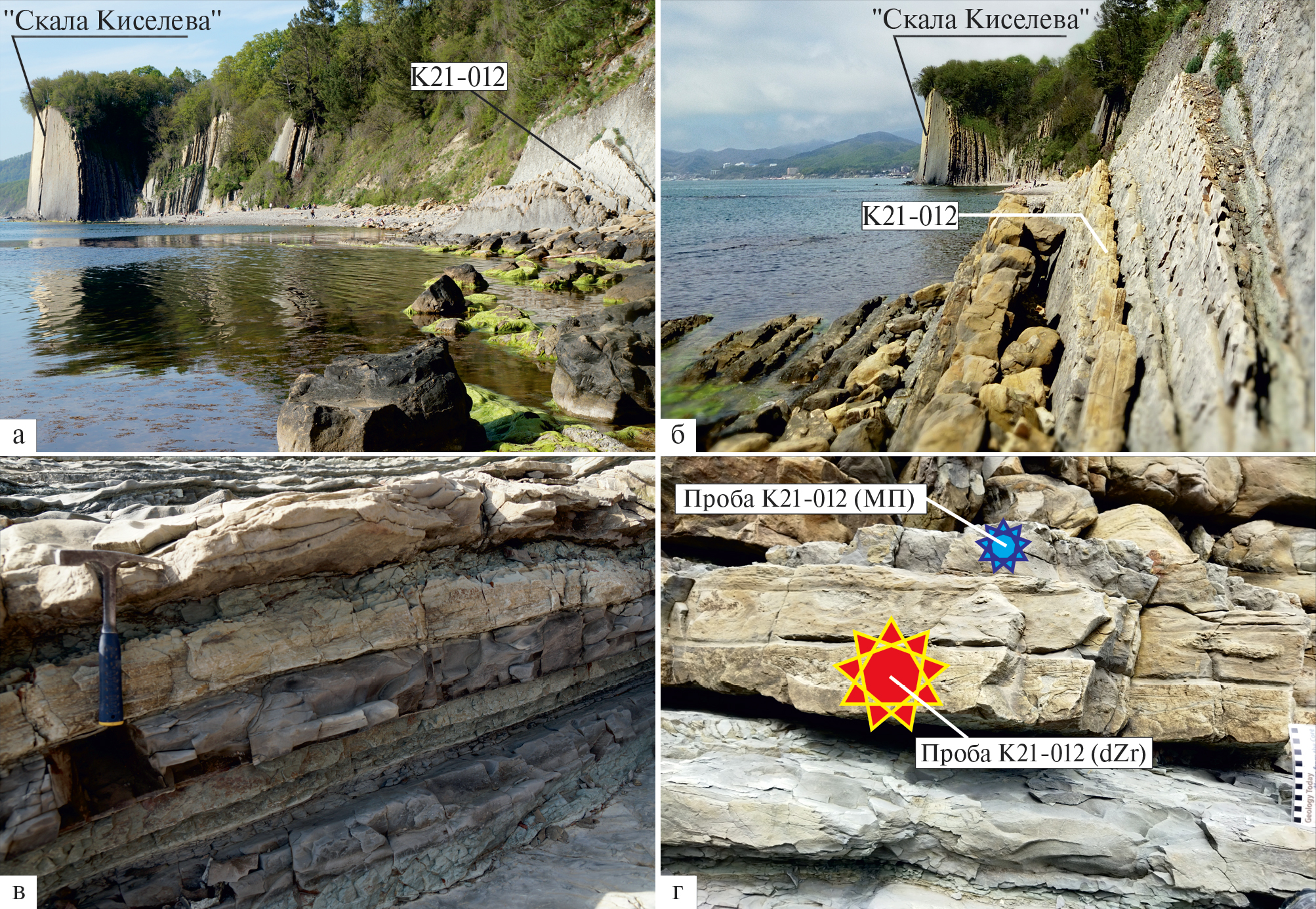 В прибрежном скальном обнажении, расположенном в 300 м на юг от южного торца скального массива, известного как “Скала Киселева” (см. рис. 2, 3а, 3б), в точке с координатами 44°06ʹ36.83ʺ с. ш. 39°01ʹ59.13ʺ в. д. из известковистого песчаника основания одного из турбидитовых ритмов отобрана проба К21-012 (см. рис. 3г) начальным весом около 3 кг.