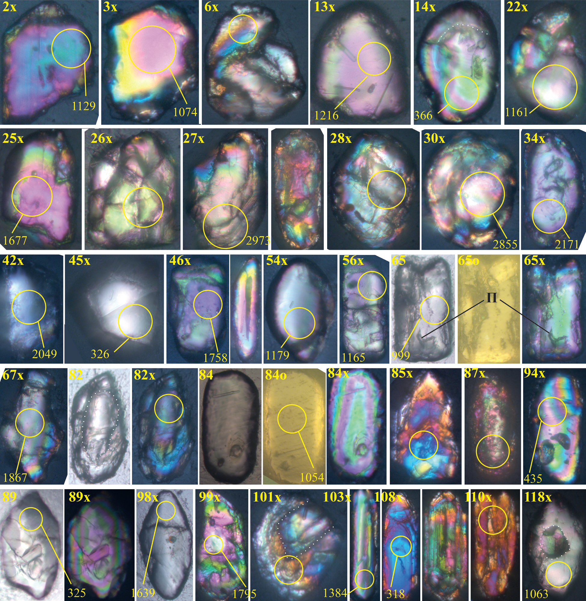 Три изображения без номеров – это примеры зерен с настолько сложной внутренней структурой, что в них не нашлось области диаметром 25 мк без очевидных нарушений или включений, и поэтому пробоотбор на U–Pb-датирование не проведен. Изображения 13, 14, 28, 34, 84, 89, 94, 98, 118 и др. – примеры зерен с разнообразными включениями. Три изображения зерна 65 в проходящем и отраженном свете демонстрируют пример пустотного пространства (П).