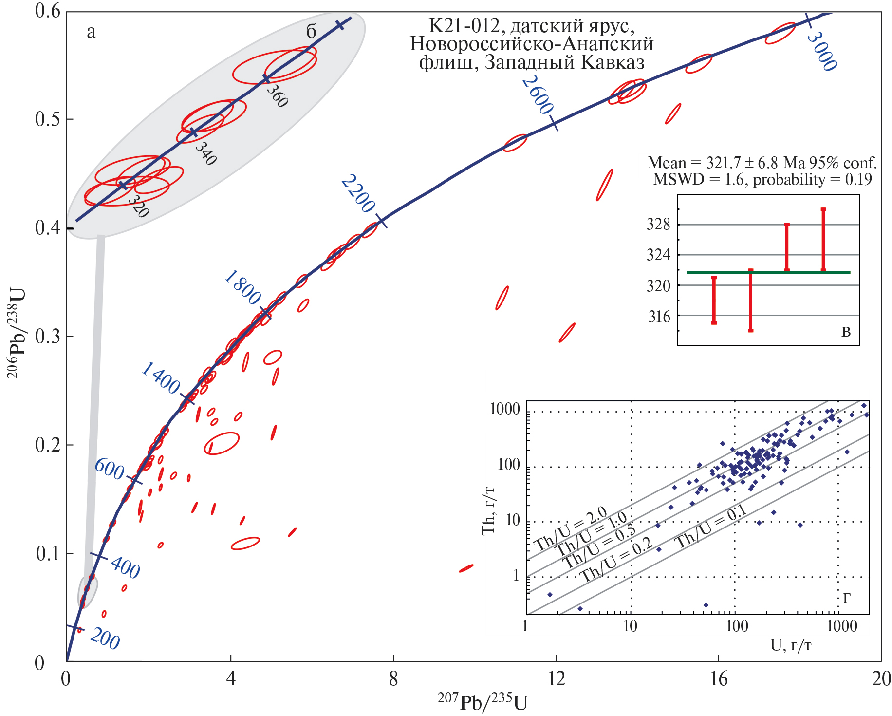 Таблица 1. Результаты U–Th–Pb-изотопного (LA-ICP-MS) датирования зерен детритового циркона из датских песчаников мел-палеоценового новороссийско-анапского флиша, широко развитого в Сочинском синклинории, расположенном на южном склоне Западного сегмента Большого Кавказа (проба K21-012)