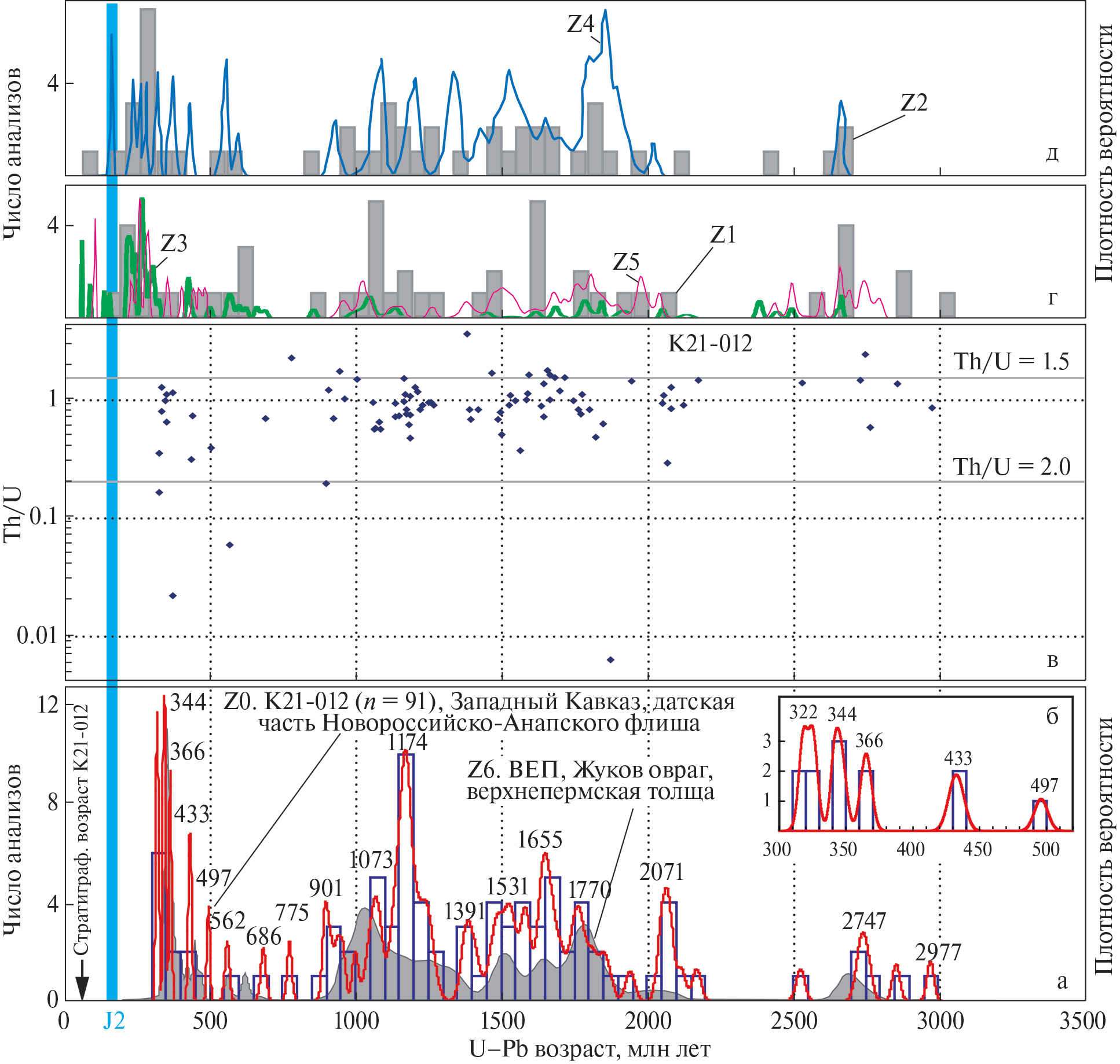 Для построения гистограммы и кривой плотности вероятности (КПВ) использованы анализы (кондиционные датировки), удовлетворяющие трем условиям: 1) –10% < D1 и D2 < 10%; 2) аналитическая ошибка измерений обеспечивает точность оценки возраста < 50 млн лет и 3) поправка на общий свинец меняет возраст < 50 млн лет.