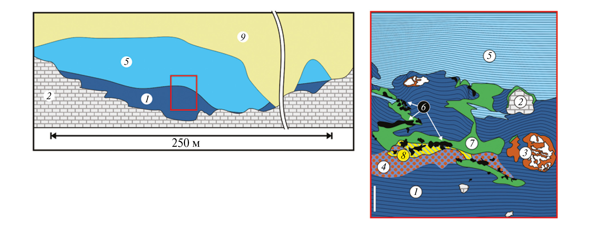 1 – монтмориллонитовые глины с дресвой карбонатных пород, редкими железистыми оолитами и линзами кварцевого песка; 2 – известняки карбона и валуны окатанных известняков; 3 – переотложенные лимонитизированные массивные сидериты; 4 – линза оолитовых сидеритолитов; 5 – перекрывающие черные (слюдистые и битуминозные) глины оксфордского яруса; 6 – нодули дельвоксита; 7 – зоны с новообразованным митридатитом; 8 – зона новообразованного фторапатита и крандаллита; 9 – четвертичные флювиогляциальные отложения