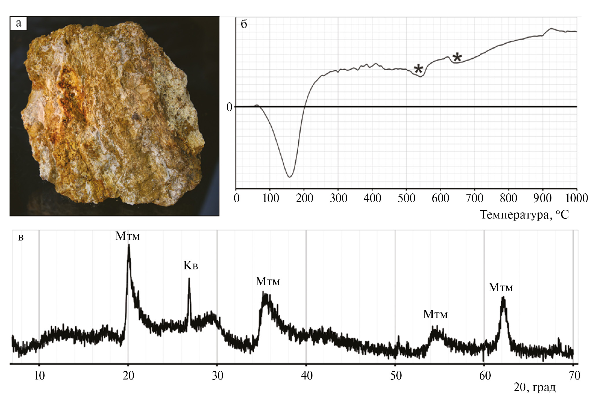 a – штуф 11×10×4 см; б – дифференциальная кривая нагревания, звездочкой помечено положение высокотемпературных эндотермических эффектов; в – дифрактограмма глинистого вещества без дополнительной подготовки (Мтм – монтмориллонит, Кв – кварц)
