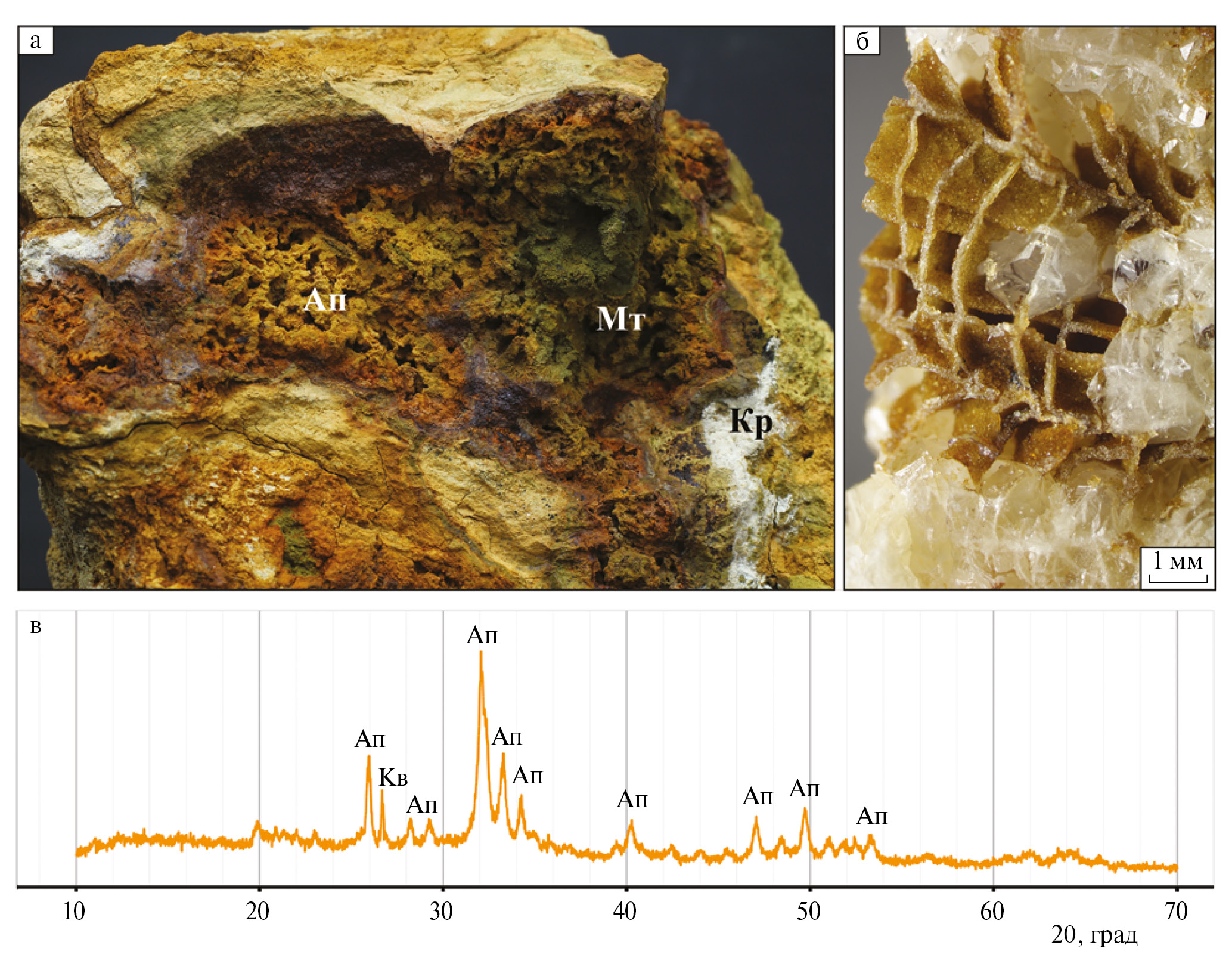 а – полная псевдоморфоза фторапатита (Ап) и митридатита (Мт) по ячеистому агрегату гетита, по трещинам развивается скрытокристаллический крандаллит (Кр), ширина поля зрения ‒ 5 см; б – псевдоморфоза фторапатита по карбонатным реликтам септ в окварцованном коралле; в – дифрактограмма фторапатита из центральной части линзы фосфатизированных пород (Ап – фторапатит, Кв – кварц)
