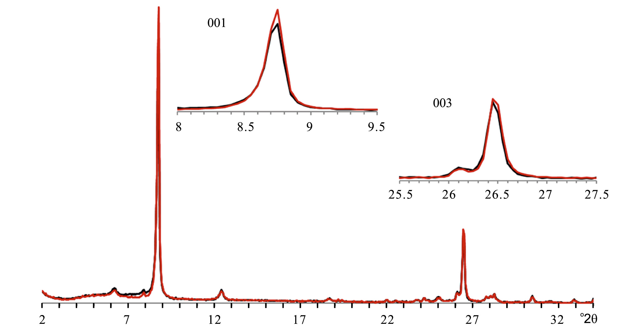 Рис. 3. Экспериментальные дифракрограммы, полученные от ориентированных препаратов исходного (черная линия) и прогретого при 300°С (красная линия) образца 3081, фракция <1 мк. На вставках показаны фрагменты дифракрограмм в увеличенном масштабе для рефлексов 001 и 003.
