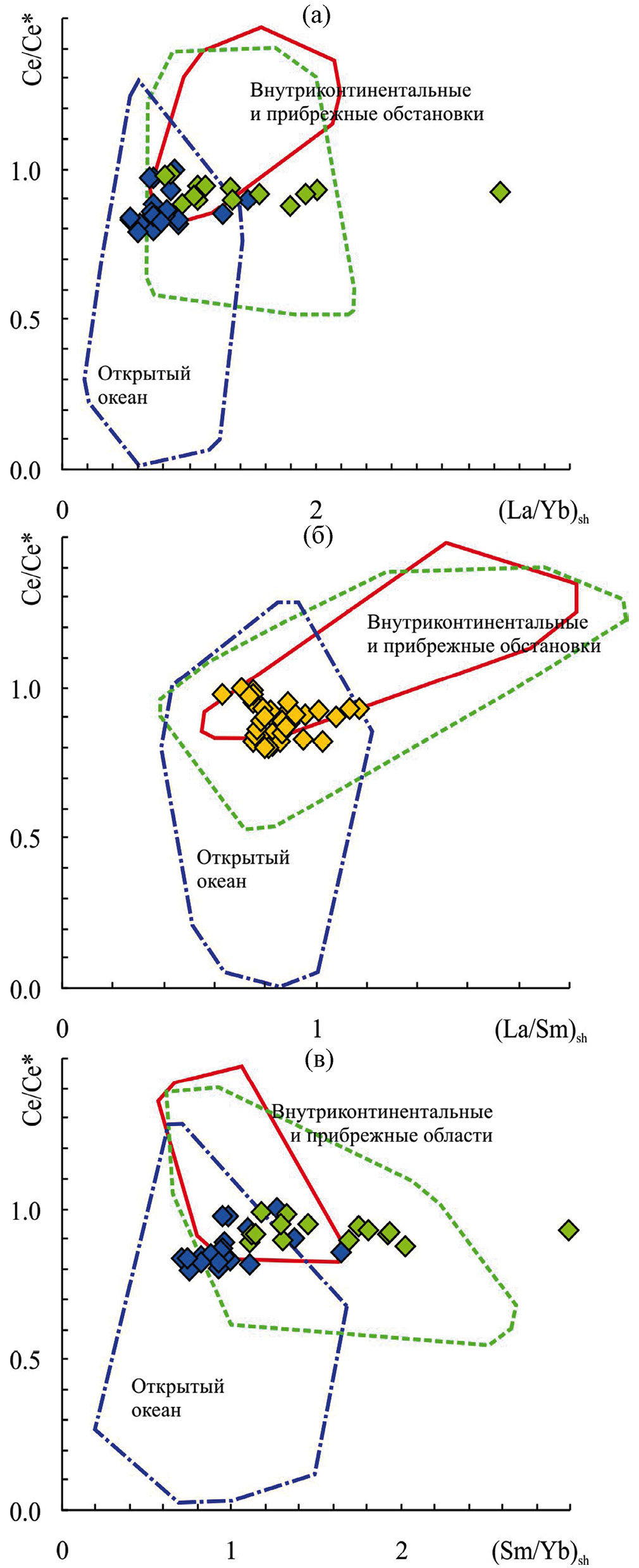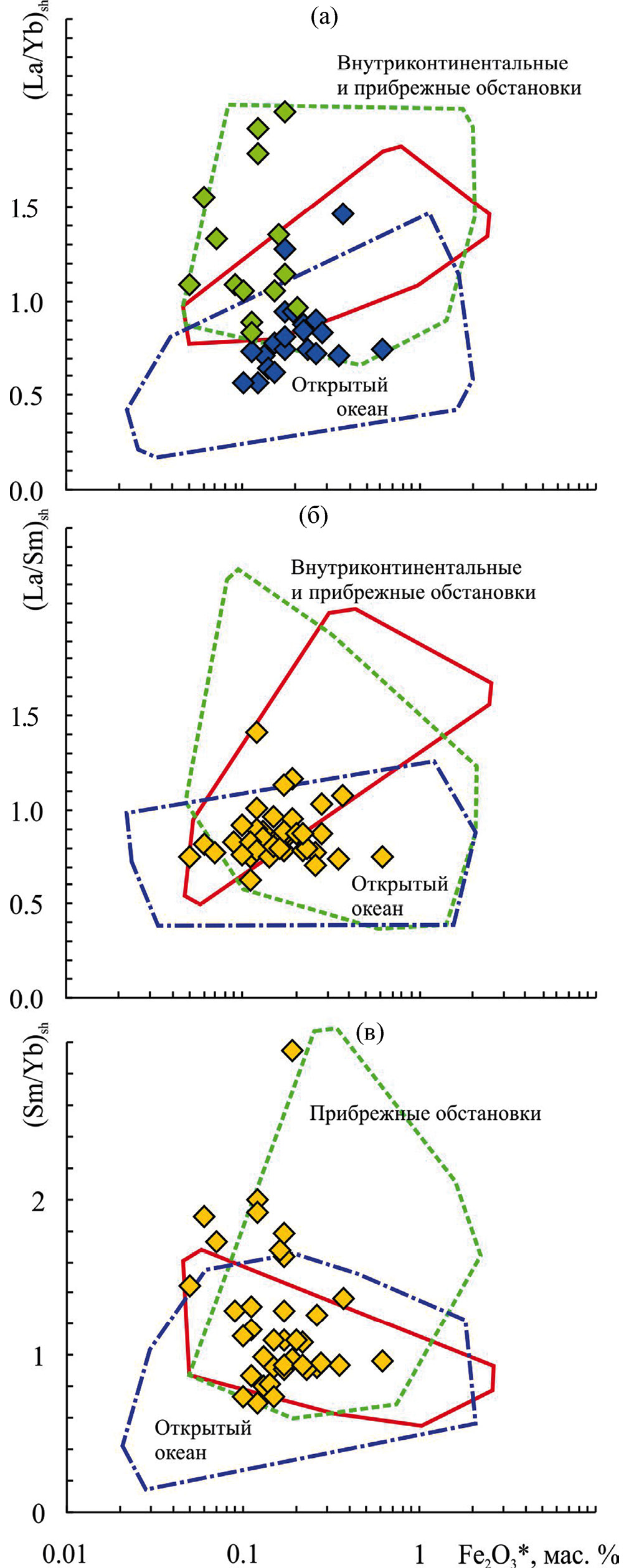 На диаграмме Fe2O3*–(La/Yb)sh также наб- людается перекрытие полей известняков всех трех групп, в то же время фигуративные точки известняков укской свиты, накапливавшихся в пределах внутреннего и верхов среднего рампа в основном приурочены к полям пресноводных и прибрежных обстановок, а точки известняков среднего рампа сосредоточены преимущественно в полях известняков открытого океана и прибрежных обстановок (рис. 6а). Эта особенность распределения известняков разных областей рампа сопоставима с той, что вырисовывается и на диаграмме Al2O3–(La/Yb)sh (см. выше). На графике Fe2O3*–(La/Sm)sh подавляющее число точек состава известняков укской свиты сосредоточено в намеченном авторами публикации [Zhang et al., 2017] поле известняков открытого океана (см. рис. 6б), но надо иметь в виду, что пересечение полей известняков разных групп и здесь достаточно значительно. Это же присуще и диаграмме Fe2O3*–(Sm/Yb)sh (см. рис. 6в), где поле внутриконтинентальных известняков практически полностью перекрыто полем известняков открытого океана. К указанной области принадлежит на данном графике и примерно треть поля прибрежных известняков.