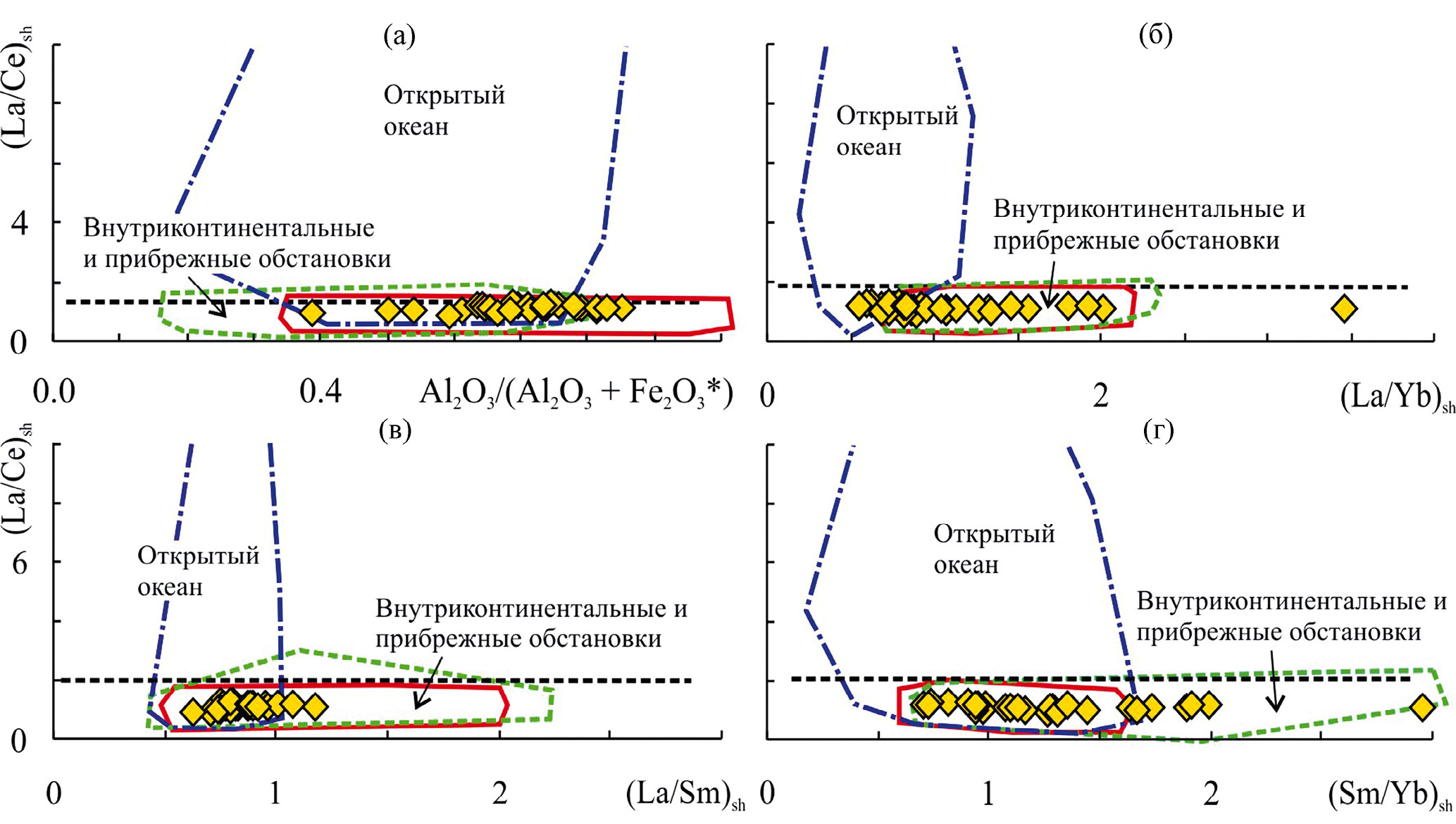 Рис. 7. Положение точек состава известняков укской свиты (вся выборка) на диаграммах Al2O3/(Al2O3 + Fe2O3*)–(La/Ce)sh (а), (La/Yb)sh–(La/Ce)sh (б), (La/Sm)sh–(La/Ce)sh (в) и (Sm/Yb)sh–(La/Ce)sh (г).