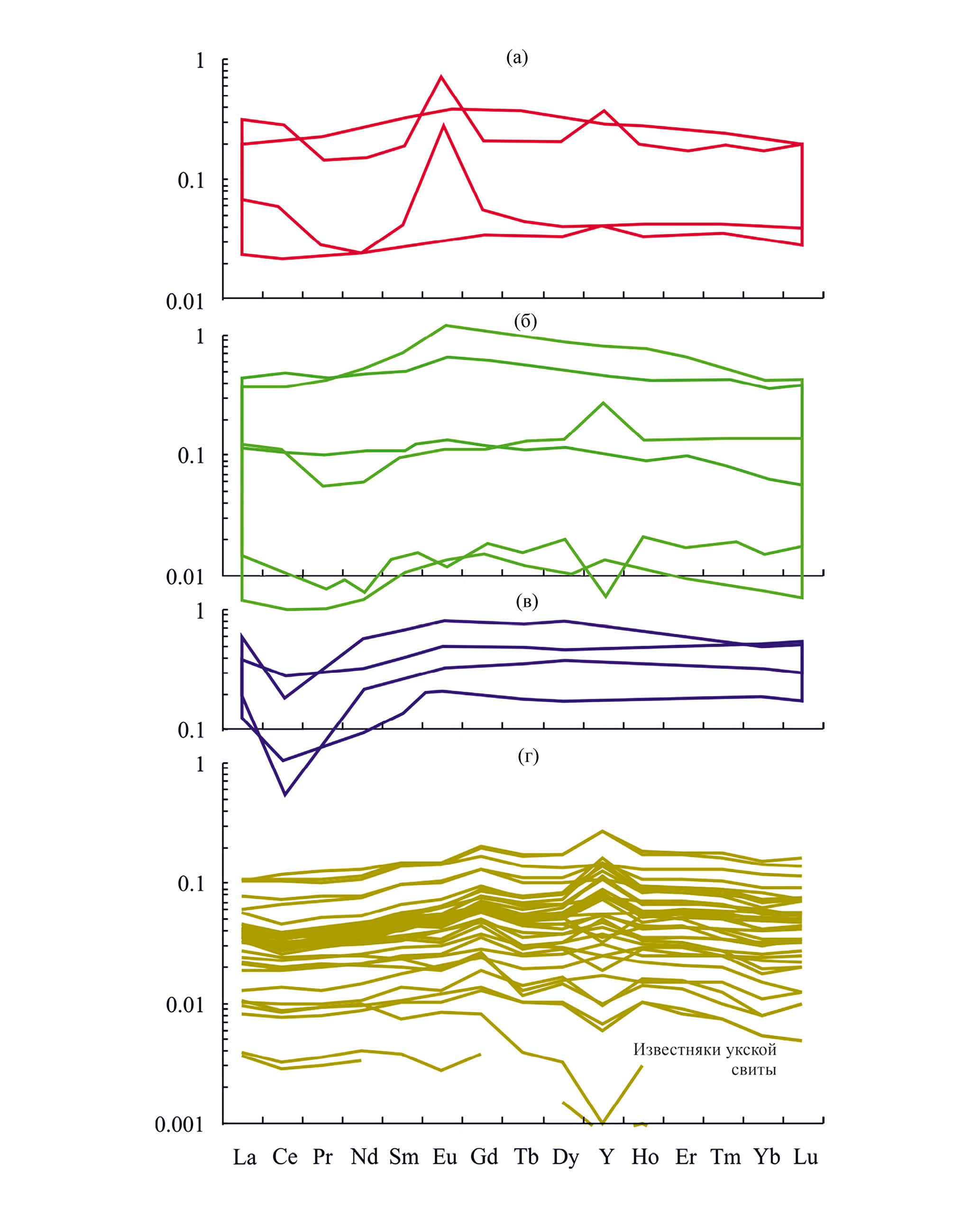 Рис. 10. Нормированное к PAAS распределение лантаноидов и Y в пресноводных известняках (а), известняках прибрежных обстановок (б), известняках открытого океана (в), все по данным [Zhang et al., 2017], и известняках укской свиты (г) верхнего рифея Южного Урала.