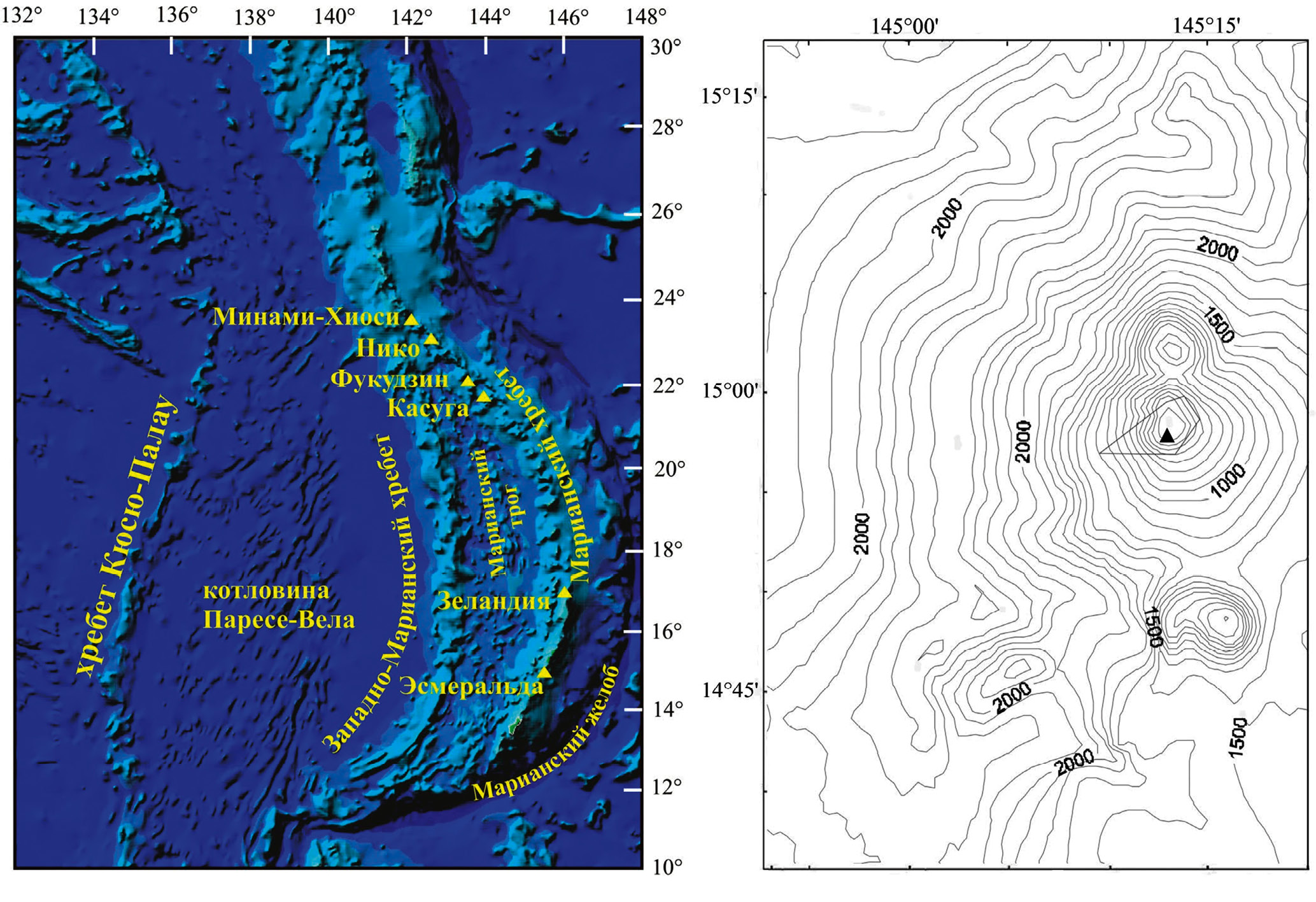 Действующий подводный вулкан Эсмеральда расположен в южной части Марианской островной дуги и поднимается с глубин 1500–2000 м (рис. 1). Диаметр основания вулкана по изобате 1500 м ~22 км. Минимальная глубина, отмеченная на вершине вулкана, изменяется в диапазоне 30–43 м [Горшков и др., 1980; Stern, Bibee, 1980]. На вершине вулкана расположен кратер глубиной 200–300 м и диаметром 2–3.5 км, открытый в западном направлении. На северо-восточной кромке кратера на глубинах около 100 м с помощью эхолотов обнаружены фумаролы [Горшков и др., 1980].