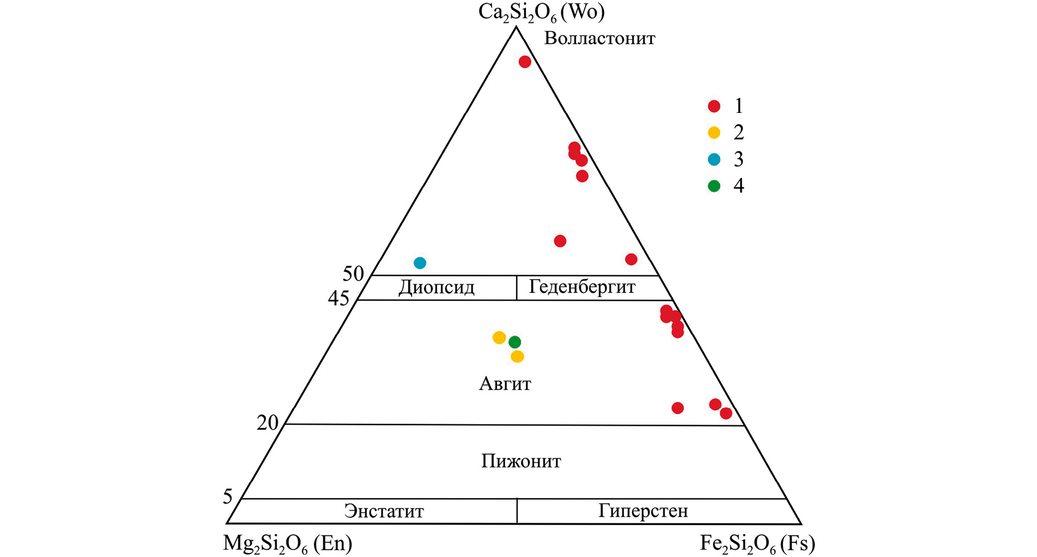 Химический состав перечисленных минералов (в том числе пироксена и плагиоклаза) отличается от такового в неизмененных андезибазальтах. Минералы, присутствующие в полости трещины и в околотрещиной зоне андезибазальта, обычно характерны для скарнов или магматических пород, претерпевших высокотемпературные преобразования, связанные с внедрением более поздних лавовых потоков. Минералогические последствия подобного внедрения в консолидированные щелочные породы вулканов Купаелло и Колле Фаббри в центральной Италии подробно исследованы А.Т. Николаевой [Николаева, 2014]. Этим автором показано, что в контаминированных щелочных вулканитах (терминология А.Т. Николаевой), согласно результатам декрепитации газово-жидких включений, волластонит кристаллизуется в интервале температур 1240–1320°С, а геденбергит при 1150–1180°C. Образование этих минералов по данным А.Т. Николаевой [Николаева, 2014] происходило из гомогенной мелилититовой магмы, обогащенной CO2 и содержащей 0.5–0.6 мас. % H2O и 0.1–0.2 мас. % F. Кроме того, внутри трещинного пространства наблюдаются переходные фазы в ряду феррогеденбергит–геденбергит–волластонит (см. рис. 6), а согласно справочным данным [Спиридонов, 2023], неограниченная взаимная растворимость пироксенов (MgMgSi2O6 – Fe+2Fe+2Si2O6 – CaMgSi2O6 – CaFe+2Si2O6) возможна только при весьма высоких температурах. Исходя из этого, логично предположить, что перечисленные минералы формировались при высокотемпературном воздействии на первичную породу.