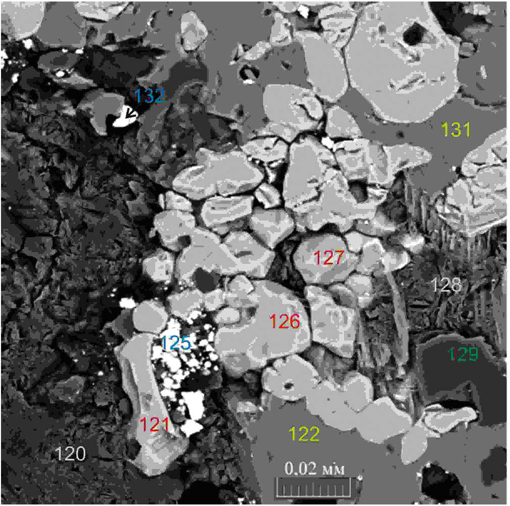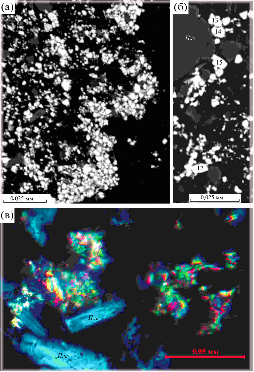 Изучение морфологии и химического состава микрообъектов проводилось на сканирующем электронном микроскопе (СЭМ) Tescan Vega-3 с микрозондовой приставкой Aztec (Чехия, г. Брно). Детектор приставки снабжен майларовым входным окошком, толщиною 0.5 мкм, что позволяло в список определяемых элементов включить углерод и кислород. Структура образцов изучалась при анодном напряжении 30 кВ, ток пучка 50 мкА, химический состав при напряжении 20 кВ. Локальность анализа около 1 мкм. Погрешность химического анализа лежит в рамках 3-й категории точности по требованиям Научного Совета по аналитическим методам. В оксидной форме это записывается как DC = 0.12 · С0.5, где С – содержание оксида в весовых процентах, DC – абсолютная погрешность. Объектом электронно-микроскопических исследований служили непокрытые полированные шлифы, сцементированные органическим материалом и напыленные золотом.