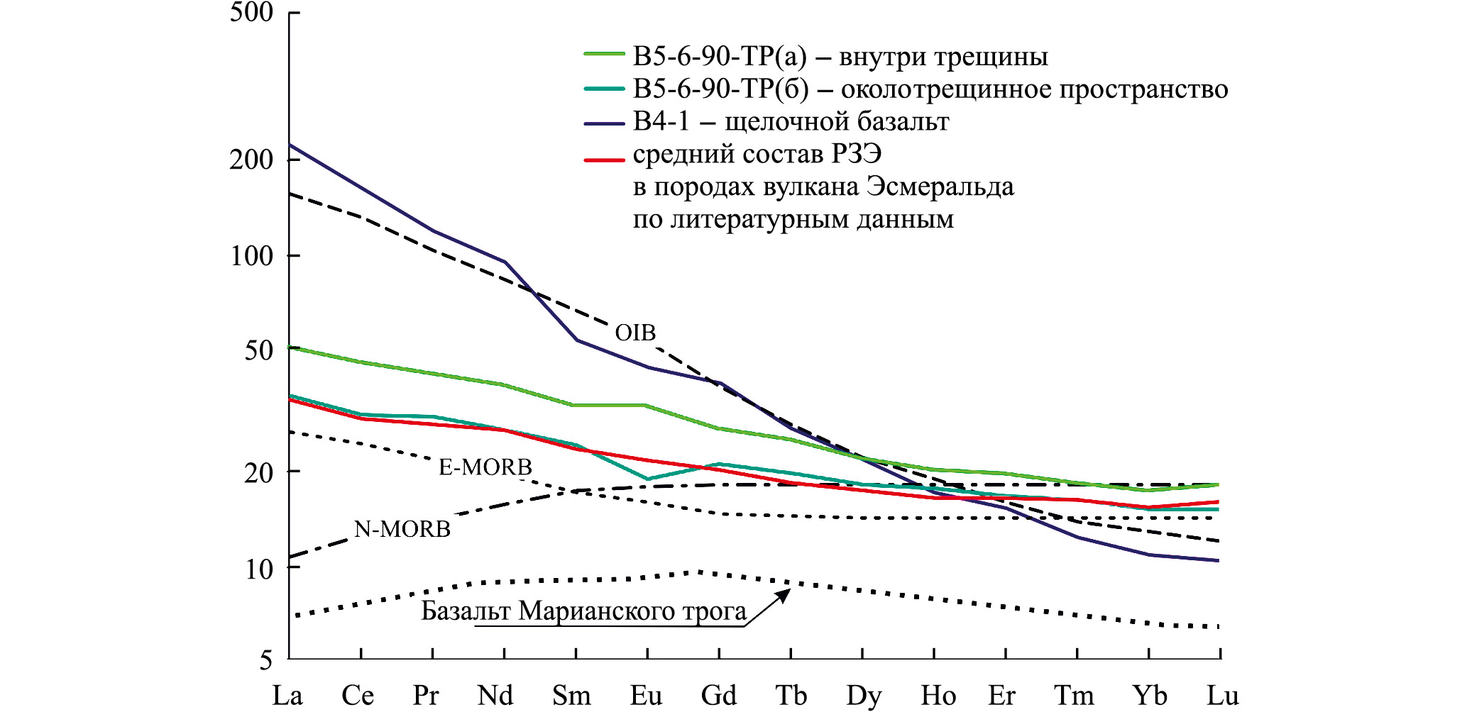 Несмотря на присутствие собственных минералов в трещинном пространстве, суммарное содержание РЗЭ в нем лишь немного превышает фоновые количества в андезибазальтах (табл. 10). В целом в андезибазальтах вулкана Эсмеральда содержание РЗЭ подобно их содержанию в области зоны Е-MORB (рис. 10). При этом можно отметить, что конфигурацию тренда E-MORB полностью повторяют РЗЭ только цериевой группы, позиция тяжелых РЗЭ тяготеет к нормальным базальтам срединно-океанических хребтов. В анадезибазальте образца В5–6–90ТР тренд содержания РЗЭ в породе практически полностью повторяет общий тренд для базальтов и андезибазальтов Эсмеральды, при этом абсолютные значения содержаний чуть выше. В полости трещины направление тренда сохраняется, но содержание всех компонентов заметно выше.