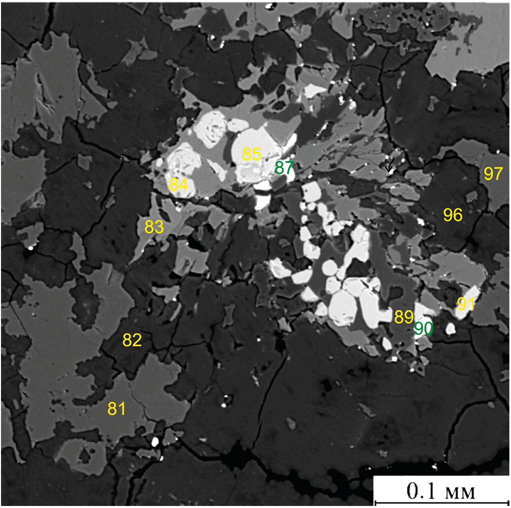 Минералы: № 81, 97 – арагонит, № 82, 96 – сапонит, № 83 – геденбергит, № 89 – плагиоклаз, № 84, 85, 91 – гематит, № 87, 90 – халькопирит.