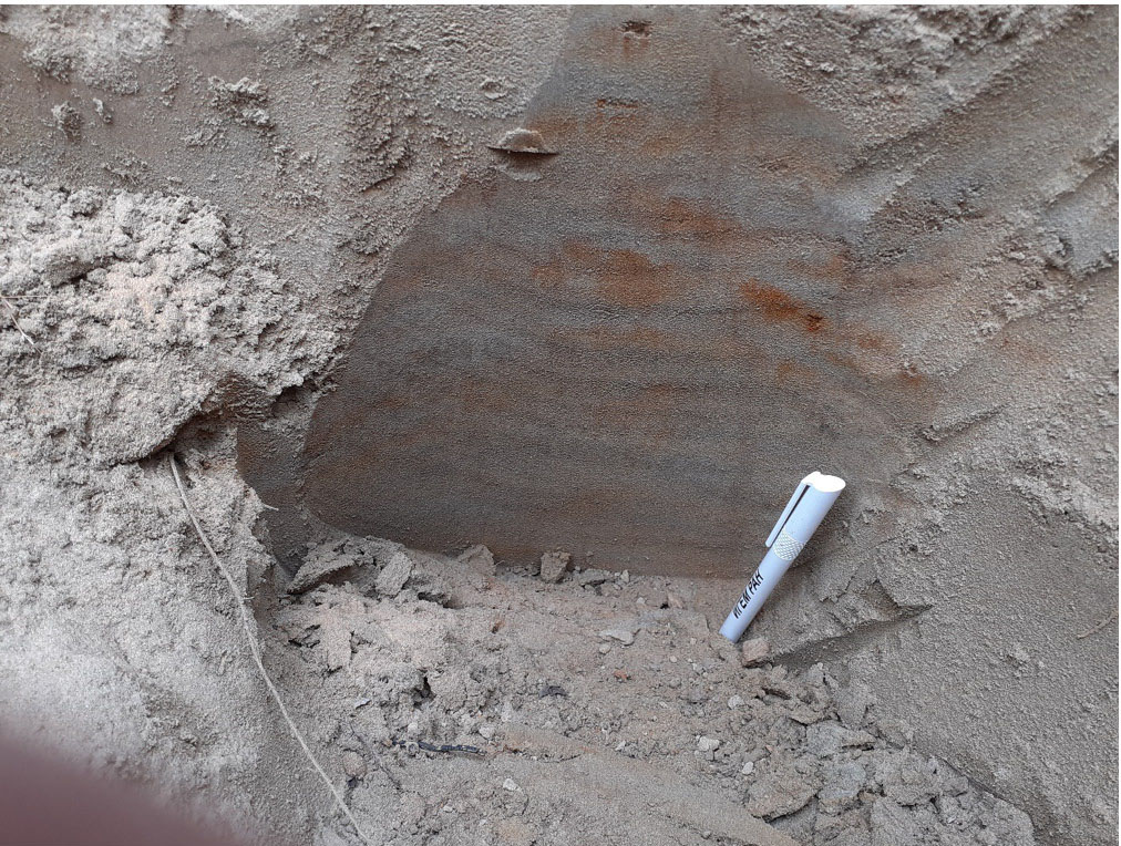 Рис. 4. Продуктивный пласт Итмановской россыпи: темные прослои содержат повышенные концентрации рудных минералов – ильменита, рутила, хромита и циркона.