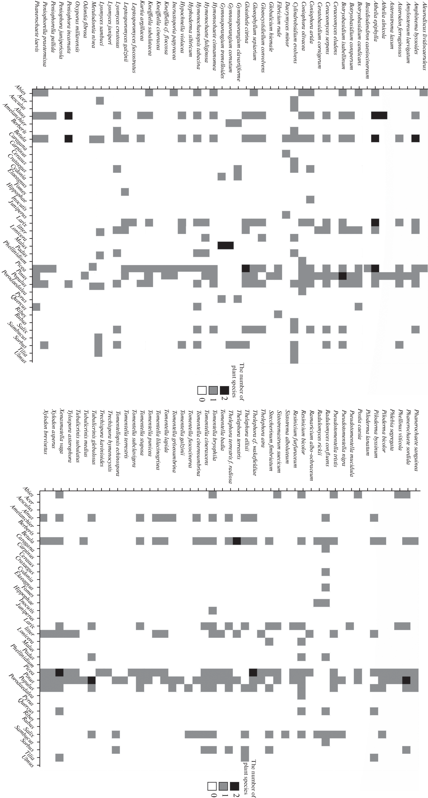 The paper is devoted to ecological and biodiversity studies on basidiomycetes associated with common juniper (Juniperus communis) from subtaiga zone of Belarus as well as several taiga regions of the European part of Russia, namely, the Leningrad Region, the Republic of Karelia, the Komi Republic, the Arkhangelsk Region, the Murmansk Region. The taiga zone represents an ecological-coenotic optimum of common juniper and the widest spectrum of its fungal consorts is expected to be revealed. A total of 96 species of wood-inhabiting basidiomycetes, both from dead and living wood, were recorded in association with J. communis in the boreal regions of Belarus and the European part of Russia. These species belong to the Pucciniomycetes (Pucciniales, 3 species), Dacrymycetes (Dacrymycetales, 1 species), and Agaricomycetes (Agaricales, Atheliales, Auriculariales, Boletales, Cantharellales, Gloeophyllales, Gomphales, Hymenochaetales, Polyporales, Russulales, Thelephorales, Trechisporales, 92 species). An annotated species list is given, including an expanded substratum and ecology datasets. The ecological and geographical preferences of these fungi and the strength of their connection with juniper were analyzed by thermal map, clusterization, and Sankey diagram methods. The various types of wood decomposition by juniper-associated basidiomycetes were discussed. The global distribution pattern of the species was analyzed. It was concluded that the biota of basidiomycetes associated with juniper in Eastern European taiga forests is a heterogeneous and heterochronous formation, where it is possible to distinguish clearly a florogenetically ancient core of the species specialized on juniper, exhibiting in one or other way biotrophic properties, and several taiga sets of species (suites) connected with pine trees and their litter as well as with spruce-pine-leaved taiga mosaics and boreo-nemoral mosaics typical of the Northern Hemisphere.