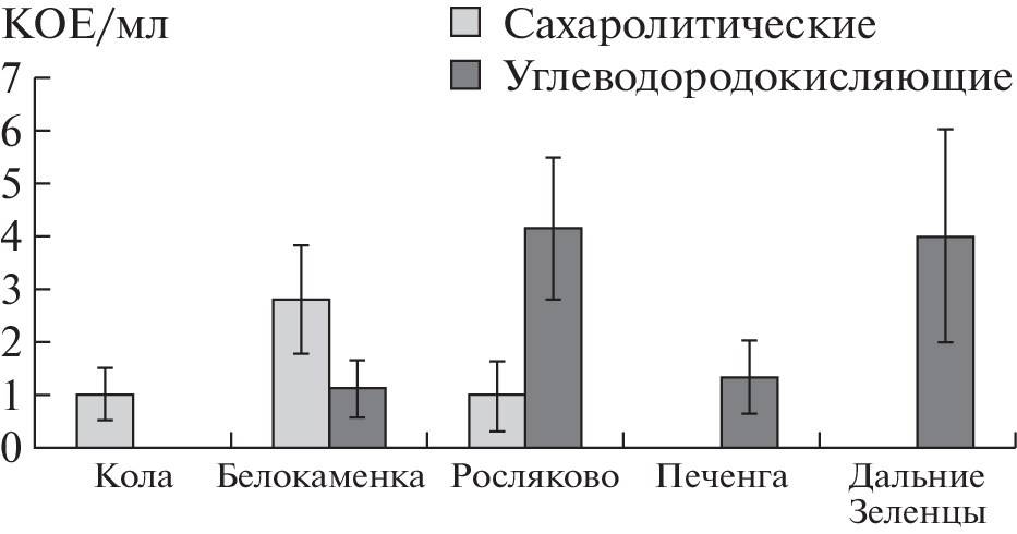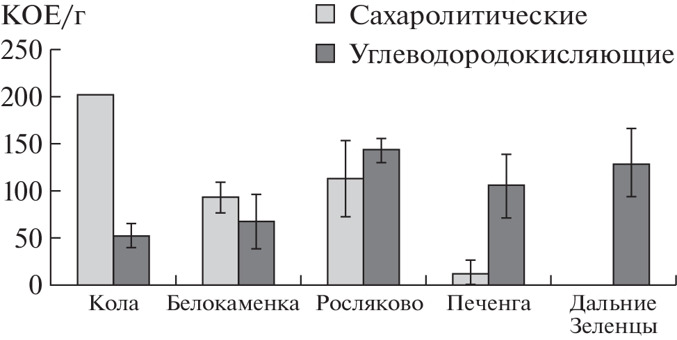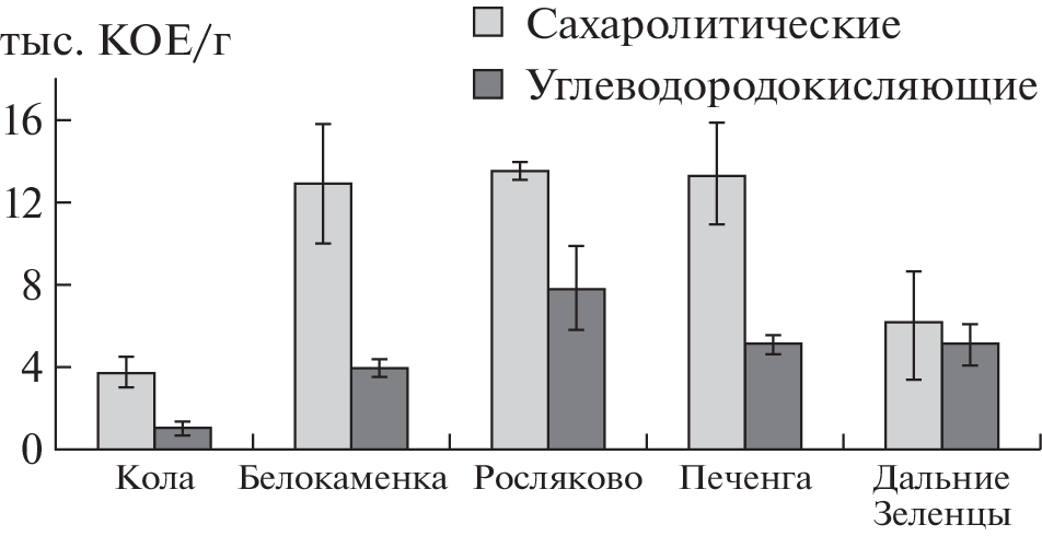 Исследованы численность и видовое разнообразие культивируемых микроскопических грибов, выделенных из морской воды, грунта литорали и почвы супралиторали на побережье Баренцева моря. Сообщества микромицетов представлены преимущественно факультативными морскими грибами терригенного происхождения. Выделенные изоляты в основном относились к анаморфным грибам отдела Ascomycota, в состав которых вошли характерные для холодных северных морей роды Penicillium, Aspergillus, Talaromyces, Trichoderma, Acremonium и др. Часто встречаемыми на исследуемой территории были виды: Aspergillus brasiliensis, Penicillium hirsutum, P. glabrum, P. spinulosum, P. janczewskii, Trichoderma koningii, T. viride, Talaromyces purpureogenus. Количество грибов в прибрежной почве на два-три порядка выше, чем в грунтах литорали и в среднем составляло от 4 до 13 тыс. КОЕ/г. В морской воде численность грибов насчитывала всего несколько единиц на мл. Максимальное количество сахаролитических грибов отмечено в почвах супралиторали. В грунтах литорали и морской воде численность углеводородокисляющих грибов изменялась от 52.5 до 143.3 КОЕ/г и от 0 до 4 КОЕ/мл соответственно. Численность сахаролитиков варьировала от 0 до 113 КОЕ/г – в грунте литорали и от 0 до 3 КОЕ/мл – в морской воде на всех исследованных участках, за исключением наиболее загрязненных, где достигала значений 200 КОЕ/г. Увеличение доли сахаролитических грибов в морской воде и грунте литорали может свидетельствовать об антропогенном загрязнении данной территории, в том числе углеводородами и другими соединениями органической природы. Урбанизированные р-ны Кольского залива с высокой антропогенной нагрузкой характеризовались более богатым видовым разнообразием и увеличением доли патогенных и условно-патогенных форм микроскопических грибов. Высокий уровень загрязнения углеводородами негативно отразился на численности сахаролитических грибов, в то время как более низкие значения содержания углеводородов не влияли на количество сахаролитиков. Численность грибов, выращенных на минеральной среде Чапека с добавлением нефти, снижалась по мере увеличения количества углеводородов как в морской воде, так и в грунте литорали, что может свидетельствовать о высокой уязвимости микромицетов к данному типу загрязнения.