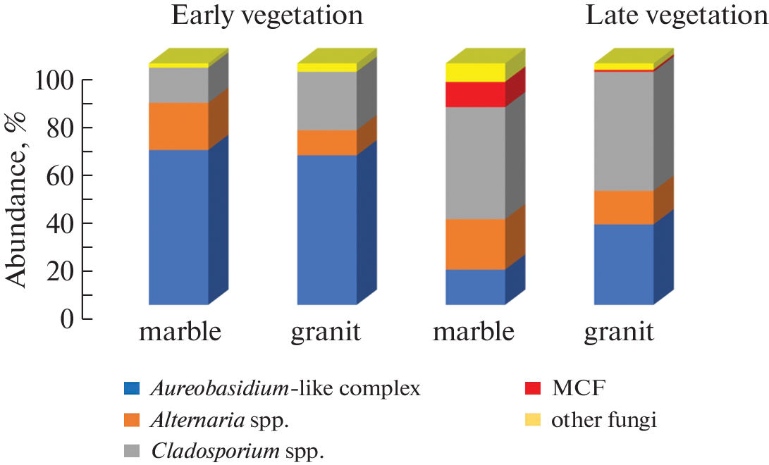 Fungi play an important role in colonization and biodeterioration of stone monuments in the open air. This study significantly complements the data on fungal diversity in lithobiotic communities through the use of metagenomic analysis. It was shown that the mycobiota of tombstones in the historical center of St. Petersburg has a complex structure. There are different complexes of species, which have various origins and ways of getting to the monuments. The complex of dominant fungi in SABs on marble and granite in St. Petersburg is formed by dark-colored micromycetes. At the species level, the absolute dominant in all samples was the Knufia karalitana according to metagenomic data and Aureobasidium pullulans according to cultural data. The use of two methodological approaches indicates the expediency of combining culture-based and molecular genetics methods, which make it possible to obtain the most more complete picture of the formation of lithobiotic communities. The season and the type of biofilm have a key importance for the abundance and diversity of micromycetes on stone surface. It was shown that type of rock has a minimal importance for the fungal diversity on stone monument.