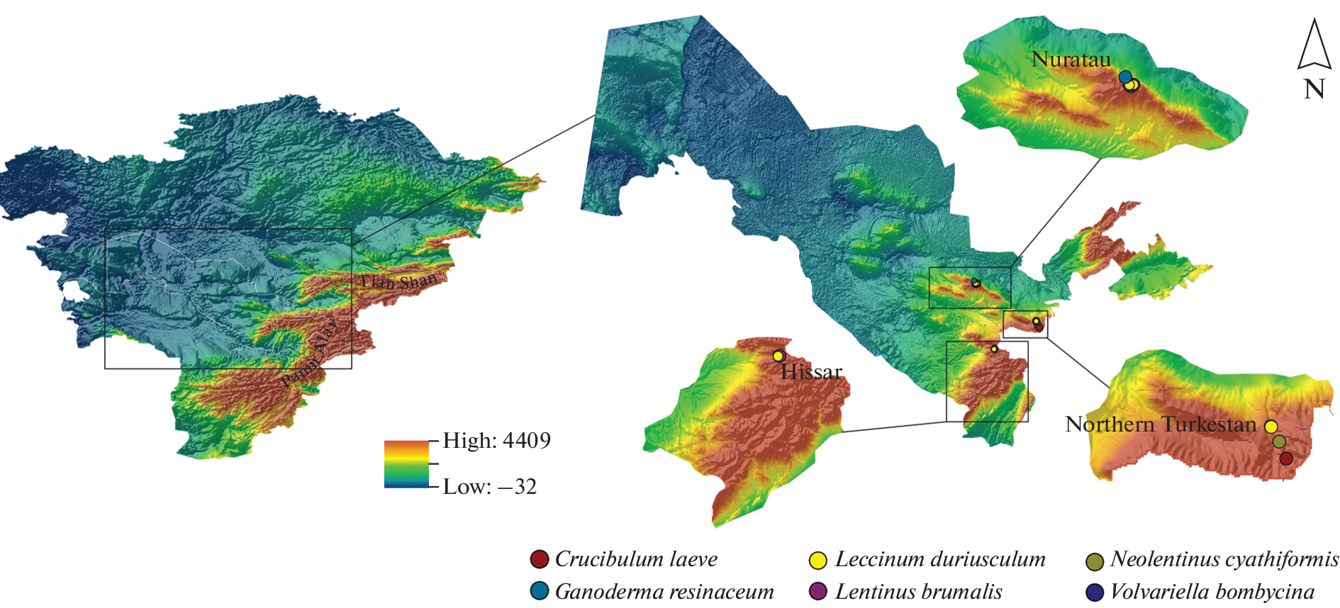 New data on basidiomycete species (Crucibulum laeve, Ganoderma resinaceum, Leccinum duriusculum, Lentinus brumalis, Neolentinus cyathiformis, and Volvariella bombycina) recorded for the first time for the Pamir-Alay ranges in Uzbekistan is presented. All collections were made within protected areas of the Zaamin National Nature Park, the Nuratau Nature Reserve, and the Kitab State Geological Reserve. Detailed information on studied specimens deposited in Tashkent Mycological Herbarium of the Institute of Botany of Academy of Sciences of Uzbekistan (TASM), including geographical coordinates, descriptions of localities, substrates and habitats, date of collection, as well as the herbarium numbers, is provided. The history of macrofungi studies in Pamir-Alay is briefly described.
