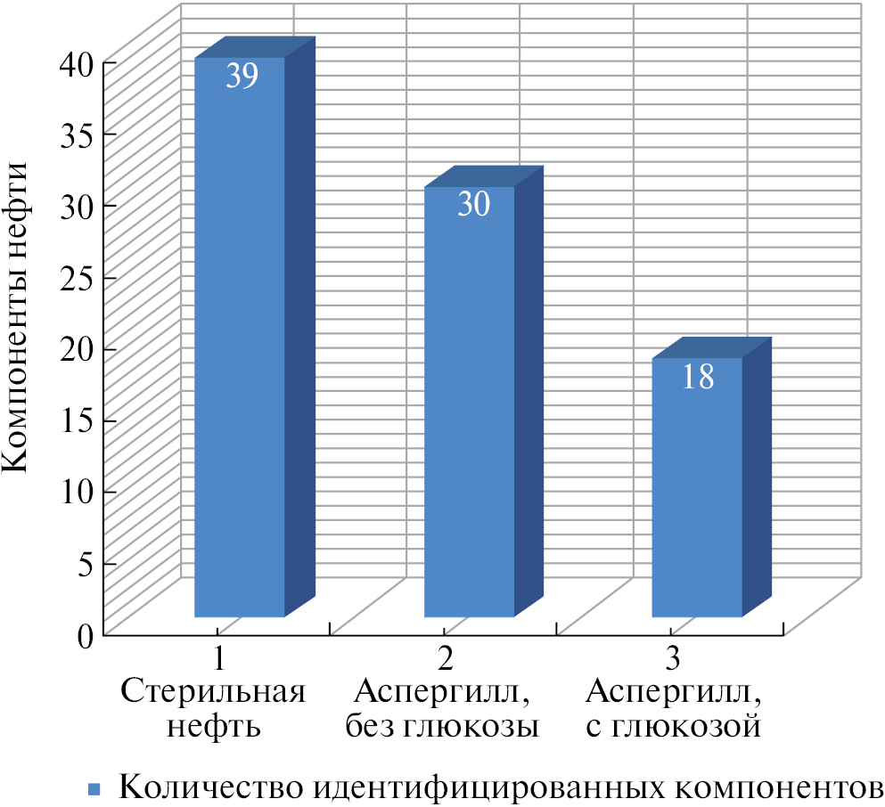 Усредненное из трех анализов ГХ–МС количество сигналов в стерильной нефти месторождения Первомайское (негативный контроль), нефти с посевом АМ1 без глюкозы и с глюкозой, составило 22, 21 и 9 соответственно, т. е. в присутствии глюкозы в качестве основного источника углерода нефть подвергается глубокой деструкции микромицетом A. niger. Без глюкозы деструкция тоже происходит, но медленная и неглубокая. Эти результаты анализа совпадают с визуальной оценкой, согласно которой в положительном контроле без глюкозы видимый рост мицелия не наблюдается. Можно предположить, что A. niger в отсутствие глюкозы потребляет содержащиеся в нефти вещества биологического, главным образом, бактериального, происхождения.