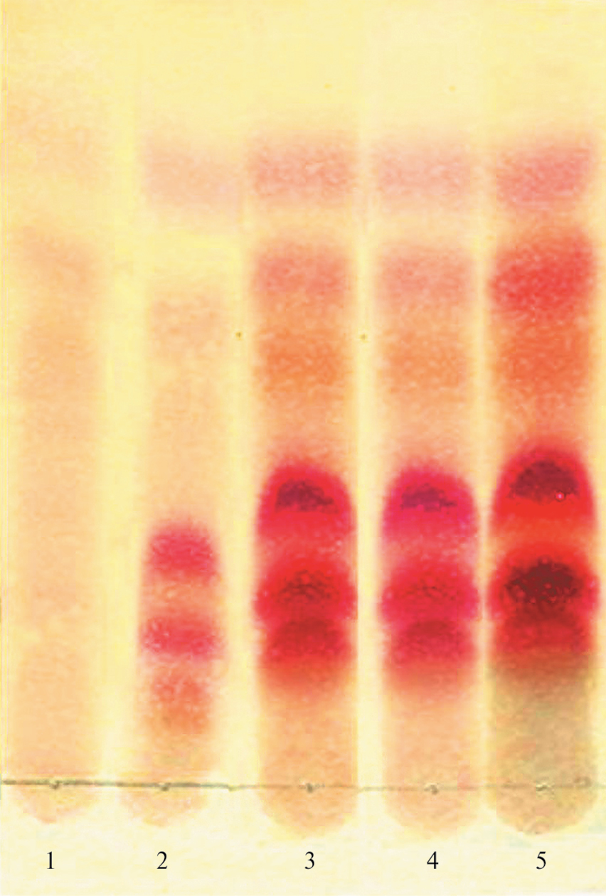 Analysis of chromatograms (Fig. 1) revealed that treatment of seeds with RL and LF EMF induces a hypersensitivity reaction in pathogen-infected tissues of hypocotyls of etiolated cotton seedlings. The areas of the chromatograms in which the phytoalexins (FA), isohemigossypol (IHG) and gossypol equivalent (GE) are detected are stained with fluoroglucin significantly more intensely when seedlings grown from inducer-irradiated seeds were used compared to when seedlings were obtained from non-irradiated seeds. Thus, the chromatographic characterisation of chloroform extracts of experimental and control cotton seedlings qualitatively indicates the FA-inducing activity of RL and LF EMF.