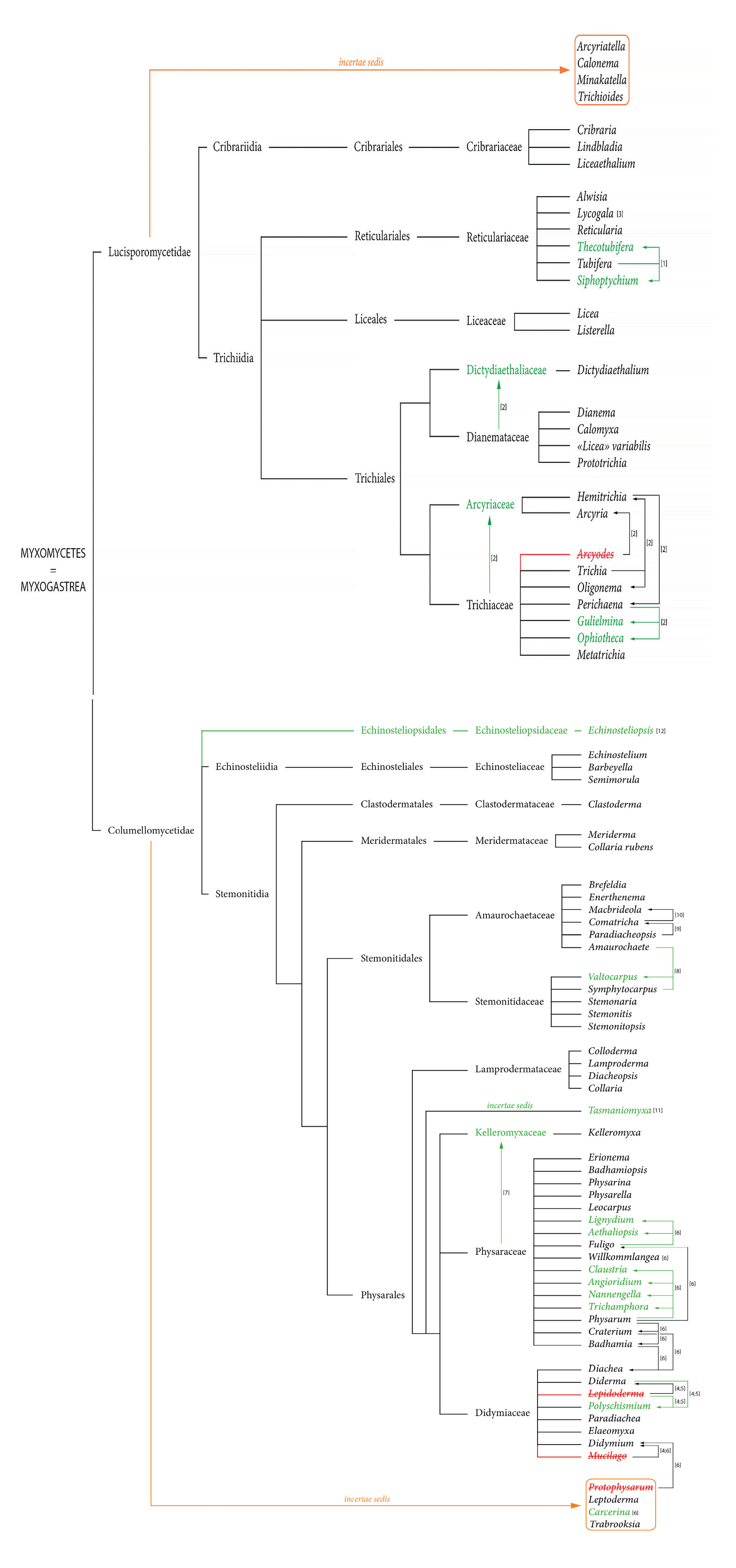 В 2023 г. также была предпринята попытка определить филогенетическое положение Kelleromyxa fimicola (Dearn. et Bisby) Eliasson – редкого вида, который формируется на помете растительноядных животных. Реконструкция филогении с использованием трехгенного выравнивания не позволила отнести этот вид ни к семейству Physaraceae, ни к Didymiaceae (Prikhodko et al., 2023b). Таким образом, его можно по-прежнему рассматривать в рамках семейства Kelleromyxaceae D. Erastova, M. Okun, A.M. Fiore-Donno, Novozh. et Schnittler (Erastova et al., 2013).