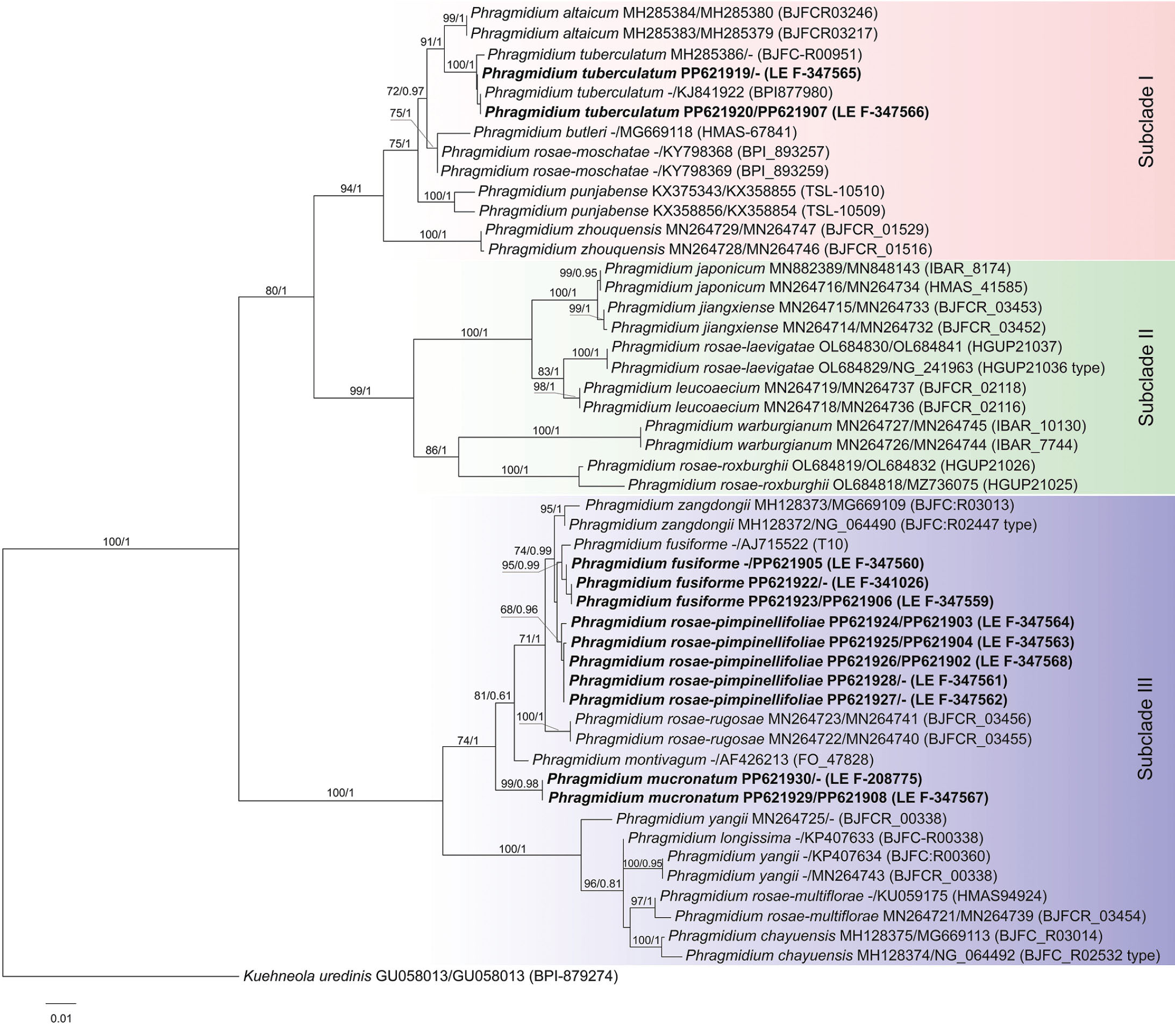All Phragmidium species included in the analyses formed three strongly supported subclades (Subclade I, Subclade II, and Subclade III), in agreement with the earlier studies (Liu et al., 2018; Sun et al., 2022).