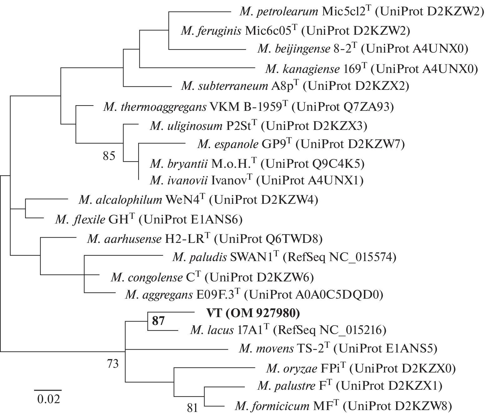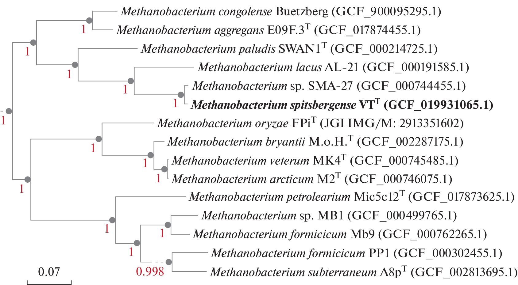 Abstract—A new strain of methanogenic archaea, designated VTT, was isolated from a sample of Spitsbergen permafrost. The cells were nonmotile curved rods, 2.7–5.3 × 0.3 µm. The optimal conditions for growth were 20°C, pH 6.6, and NaCl concentrations 0.03–0.05 M. The H2/CO2 gas mixture was the only substrate used. In the presence of H2/CO2, growth was stimulated by addition of yeast extract or rumen fluid. Phylogenetic analysis of the 16S rRNA gene sequences indicated that strain VTT belonged to the genus Methanobacterium and was most closely related to M. lacus 17A1T (97.02% similarity). Comparison of the sequenced and assembled genome of strain VTT with the genomes of other members of this genus confirmed these results and revealed species-level differences. Our results indicate that this methanogenic isolate belongs to a new species of methanogenic archaea, for which the name Methanobacterium spitsbergensе sp. nov. was proposed, with the type strain VTT (=VKM B-3566T = JCM 39284T).