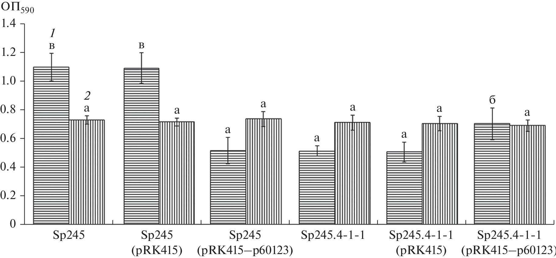 Inactivation of one of the genes (CDS AZOBR_p60123) of the ABC transporter ATP-binding protein Wzt in the p60123::aphAI mutant of Azospirillum baldaniorum Sp245 and the introduction of an additional copy of this gene into the parent or mutant strain affected the chain-length heterogeneity of O polysaccharides (OPSs) and lipopolysaccharides (LPSs), the OPS and LPS immunochemical characteristics, and the strain properties related to polysaccharide production (biofilm construction). Biofilms of the p60123::aphAI mutant Sp245.4-1-1 accumulated two times less biomass than those of Sp245. Introduction of pRK415-p60123 into the cells of Sp245.4-1-1 or Sp245 resulted in a respective increase or decrease in the ability of the resulting derivative strains to accumulate biofilm biomass, as compared with the original strains.