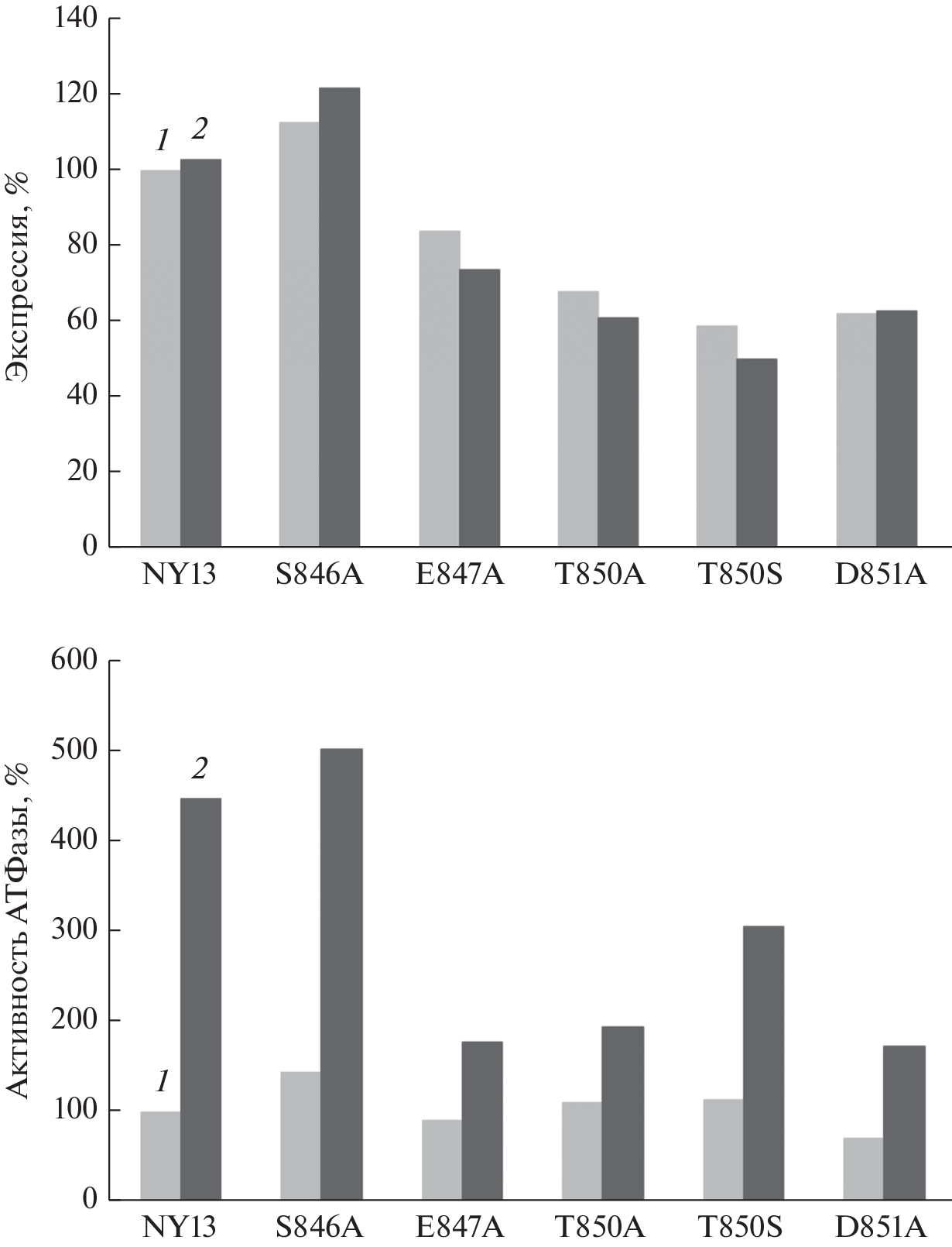 Plasma membrane H+-ATPase (PMA1), the key enzyme of yeast metabolism, undergoes multiple phosphorylation during biogenesis and functioning. In the course of this process, the ATPase is getting activated (glucose effect). We have employed site-directed mutagenesis to determine the functional role of potentially phosphorylable amino acid residues located in the extracytosolic L9-10 loop (846-SENWTD). The mutant enzyme forms were expressed at the plasma membrane to examine the effect of substitutions on biogenesis and ATPase activity. Immunobloting revealed that the mutant ATPase expression was not significantly impaired. In the absence of glucose, basal activity of the mutant enzymes differed insignificantly from that of the wild type. At the same time, regulation of the mutant E847A, T850A, and D851A enzymes has been impaired; the level of enzyme activation by glucose was lower by 2.0−2.5-fold. On the contrary, the S846A mutant displayed elevated basal activity, maintaining the ability to undergo further activation. These data indicate that these residues (especially, Ser-846, Thr-850, and Asp-851) are essential for the normal functioning of the PMA1 and its regulation by glucose.