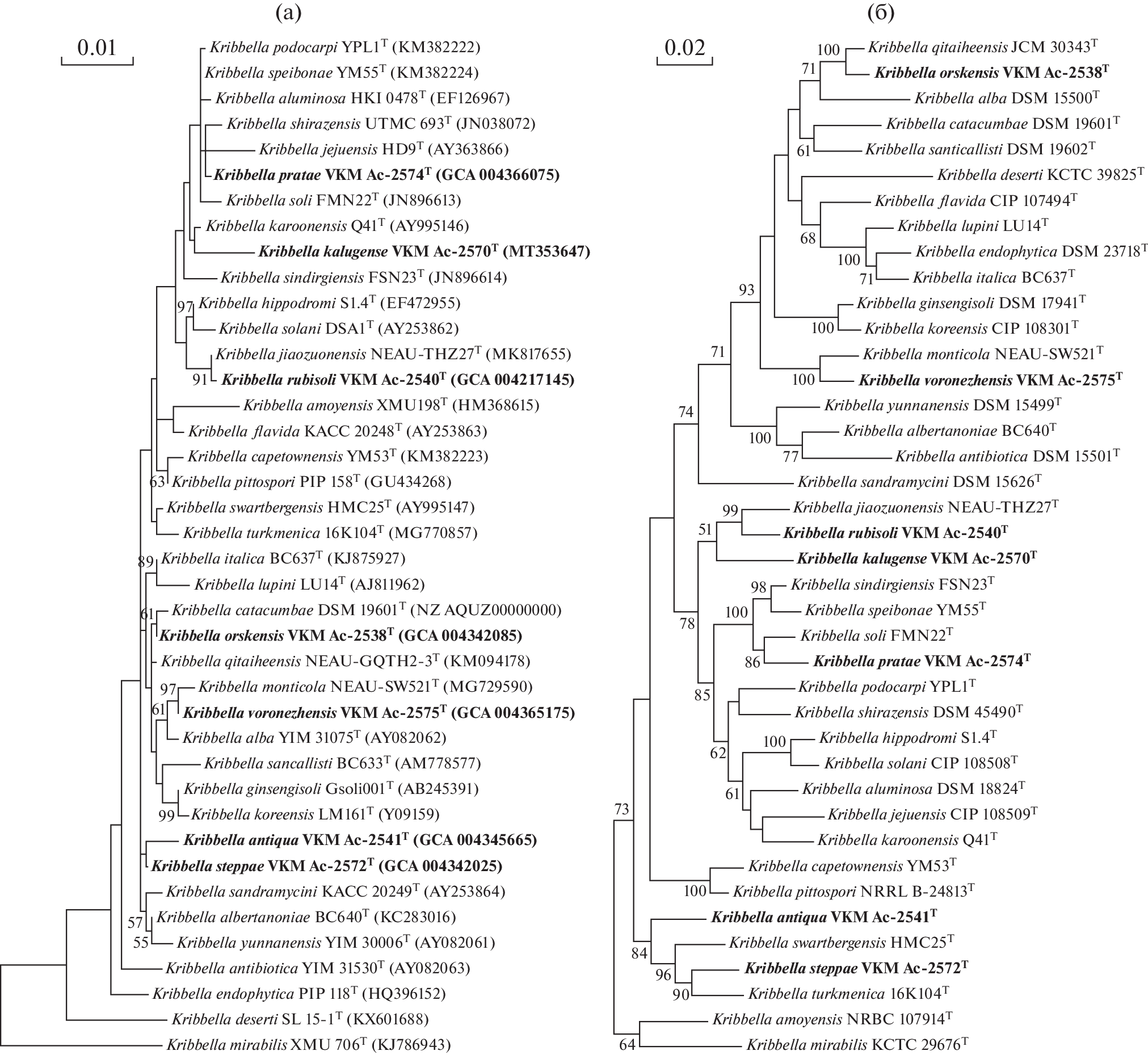 Семь изученных штаммов актиномицетов, отнесенных к новым видам рода Kribbella, были выделены из почв различных регионов России. Уровень сходства новых штаммов между собой и с типовыми штаммами известных видов этого рода по генам 16S рРНК 98.2–99.3 и 96.2–99.7% соответственно. Эволюционные расстояния на основе конкатенированных фрагментов генов gyrB–rpoB–recA–relA–atpD (4108 п.н.) для изученных штаммов и типовых штаммов известных видов были в диапазоне значений, вычисленных для описанных видов Kribbella (0.014–0.101). Значения dDDH и ANI между изученными и типовыми штаммами известных видов, для которых имеются данные по последовательностям геномов, не превышали 49.8 и 92.6% соответственно, что ниже границ прокариотных видов. Представители выявленных новых видов характеризуются индивидуальными фенотипическими профилями. У отдельных видов обнаружены (впервые у криббелл) спорангиеподобные структуры, до 4 мкм в диаметре. Клеточные стенки изученных штаммов содержат специфичные для видов или групп видов тейхуроновые и/или тейхулозоновые кислоты, структуры которых ранее не были описаны у прокариот. У всех изученных штаммов обнаружен уникальный разветвленный α-маннан. На основании результатов настоящего исследования и ранее опубликованных данных предложены описания семи новых видов: Kribbella orskensis sp. nov. (типовой штамм ВКМ Ас-2538T), Kribbella rubisoli sp. nov. (типовой штамм ВКМ Ас-2540T), Kribbella antiqua sp. nov. (типовой штамм ВКМ Ас-2541T), Kribbella kalugense sp. nov. (типовой штамм ВКМ Ас-2570T), Kribbella steрpae sp. nov. (типовой штамм ВКМ Ас-2572T ), Kribbella pratae sp. nov. (типовой штамм ВКМ Ас-2574T), Kribbella voronezhensis sp. nov. (типовой штамм ВКМ Ас-2575T), а также дополненное и исправленное описание рода Kribbella.