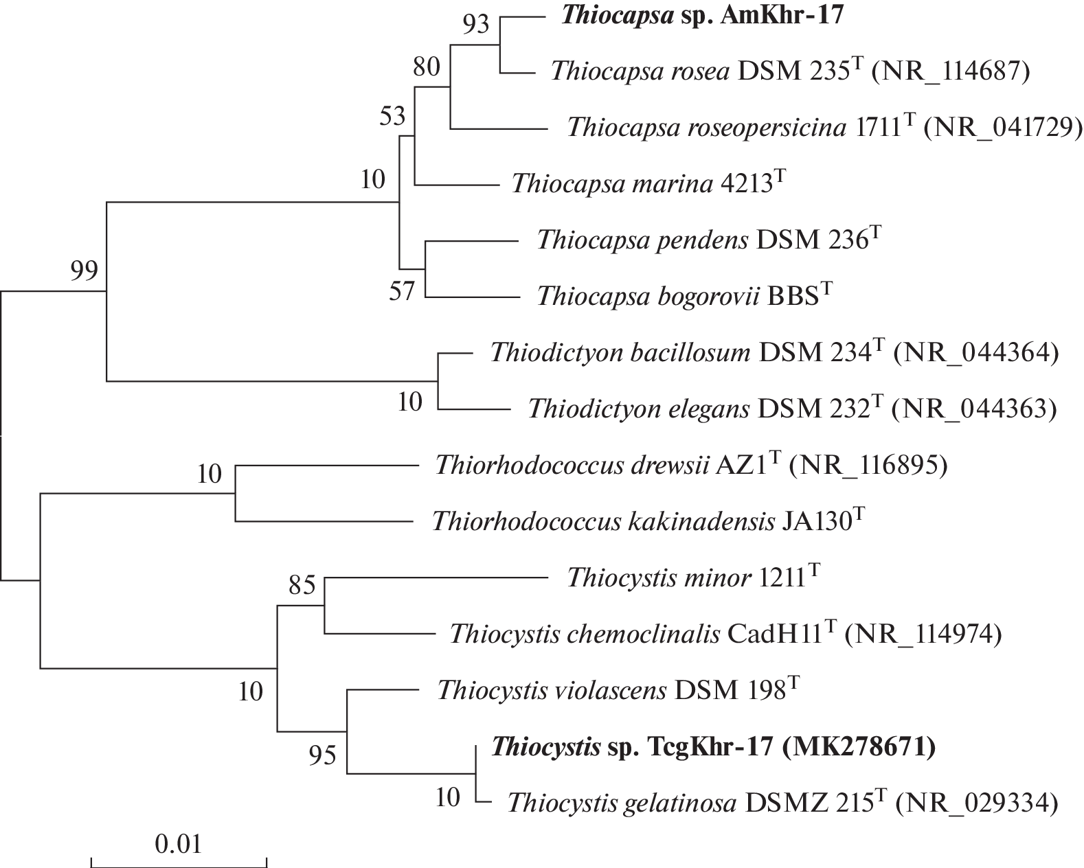 The composition and structure of the anoxygenic phototrophic bacterial (APB) community in the water column of Lake Bol’shie Khruslomeny during winter were investigated. The community developed at the depth of 4.25 m, and its activity during the ice-covered period was very low (6.2 µmol C L–1 day–1). The water in the zone of highest development of phototrophic bacteria was of an unusual lemon-yellow color, probably due to the production and accumulation of polysulfides. The near-bottom water was also of lemon-yellow color and was resistant to oxidation by the air oxygen. In the zone of peak APB development the content of BChl d from green-colored green sulfur bacteria was considerably higher than that of BChl e from brown-colored green sulfur bacteria: 77 and 23%, respectively. The cultures of green and purple sulfur bacteria were isolated from lake water, and their physiological and genetic characteristics were determined. Two strains of green sulfur bacteria (brown-colored BrKhr17 and green-colored GrKhr17) contained gas vacuoles in their cells. Phylogenetically they were most closely related to the green-colored strain Chlorobium phaeovibrioides DSM 265 and were identified as new Chlorobium phaeovibrioides strains.