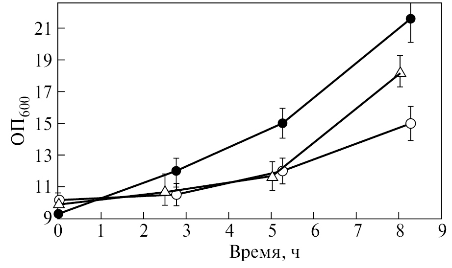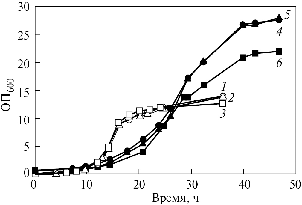 Хотя кривые роста мутантных штаммов при обычном способе посева отличались незначительно (рис. 1), мы использовали условия культивирования, когда засев производится существенным количеством биомассы, что позволяет более четко наблюдать лаг-фазу роста (см. раздел Материалы и методы исследования) (рис. 4).