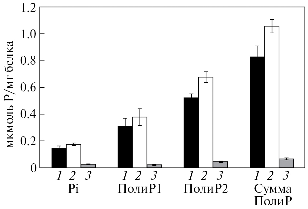 Рис. 2. Содержание полиР в митохондриях из клеток, выращенных на глюкозе, мкмоль Pi/мг белка: 1 — родительский штамм; 2 — штамм с нокаутом гена PPN1; 3 — штамм с нокаутом гена VTC4