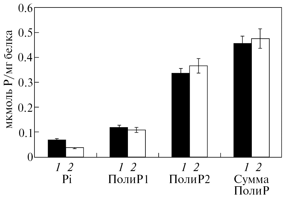 Рис. 3. Содержание полиР в митохондриях из клеток, выращенных на этаноле, мкмоль Pi/мг белка: 1 — родительский штамм; 2 — штамм с нокаутом гена PPN1